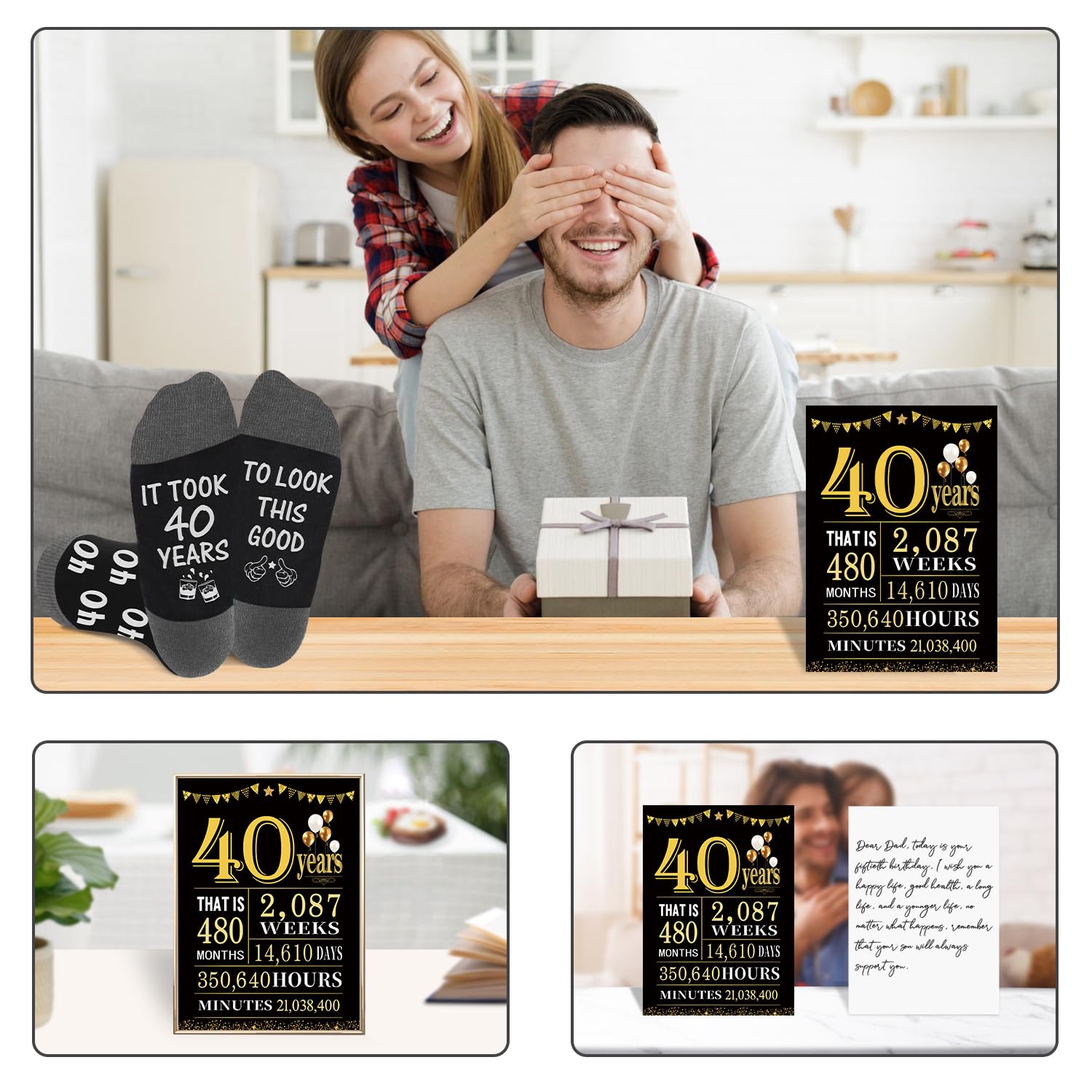 40 Year Old Gifts for Men Women: A cut 3D pop up birthday card and a 40th Poster Anniversary Card come together with the socks. The birthday greeting card made of sturdy paper and laser cutting technology to create a beautiful 3D cake scene with a highly detailed design. The anniversary card of the poster is sturdy enough to be exhibited for a long time. Can be reused multiple times in different situations