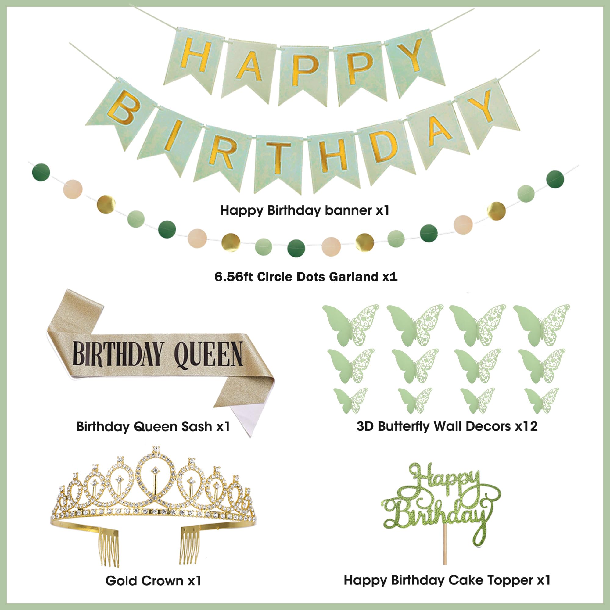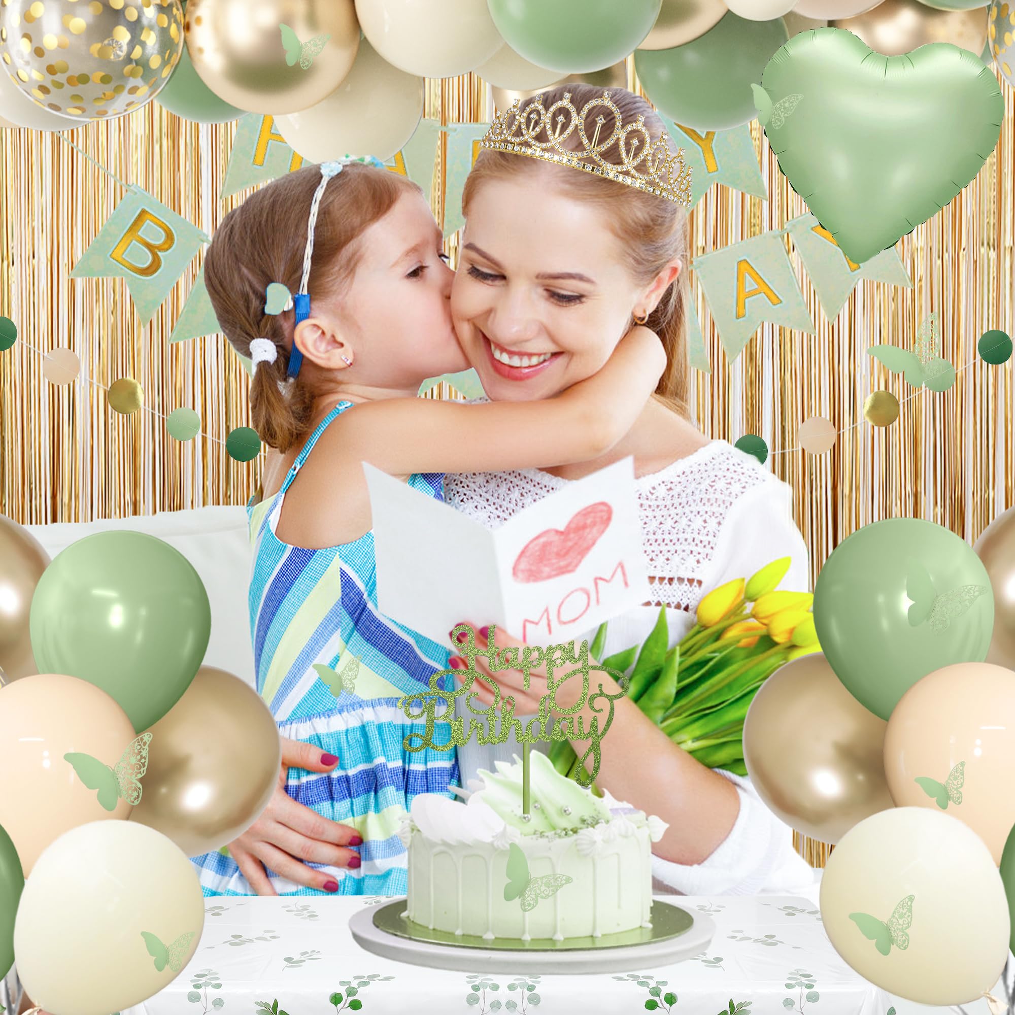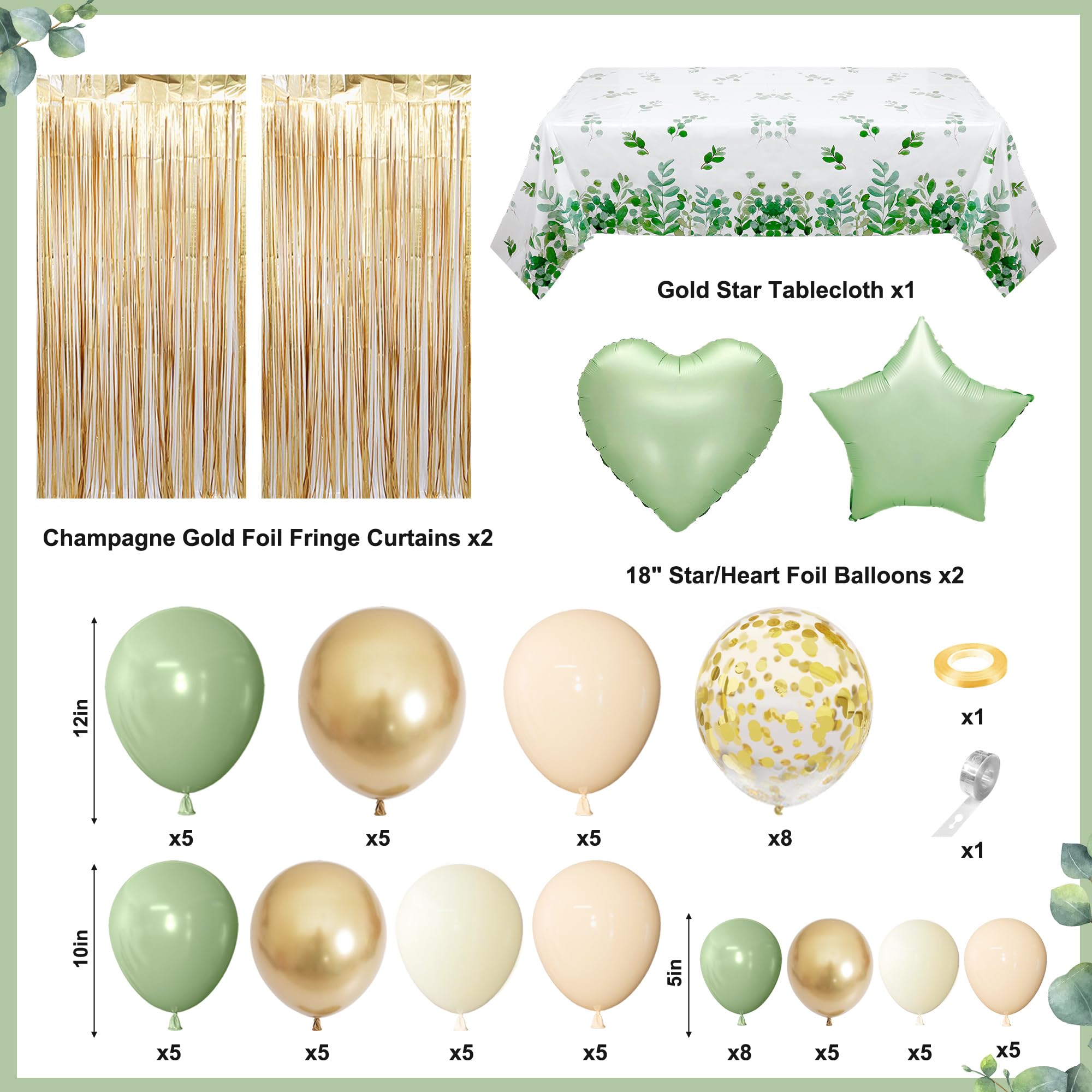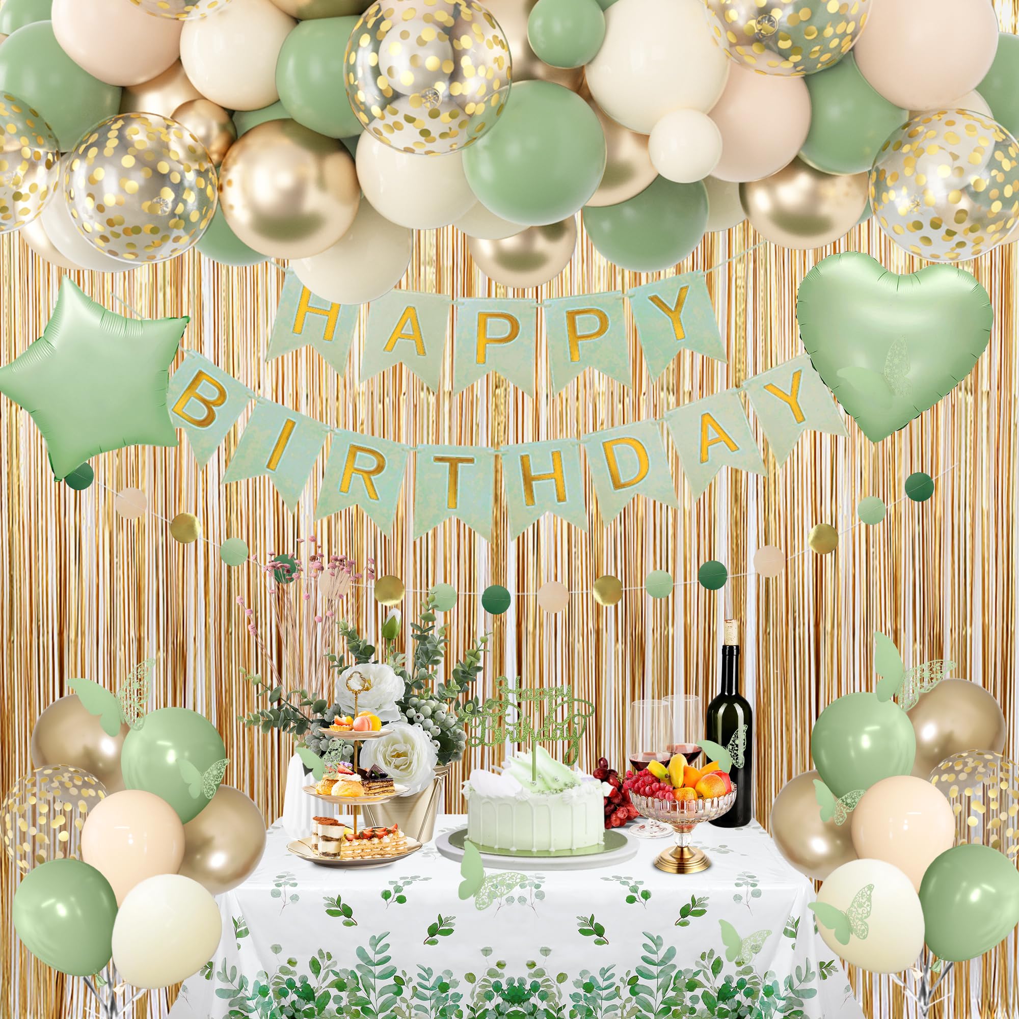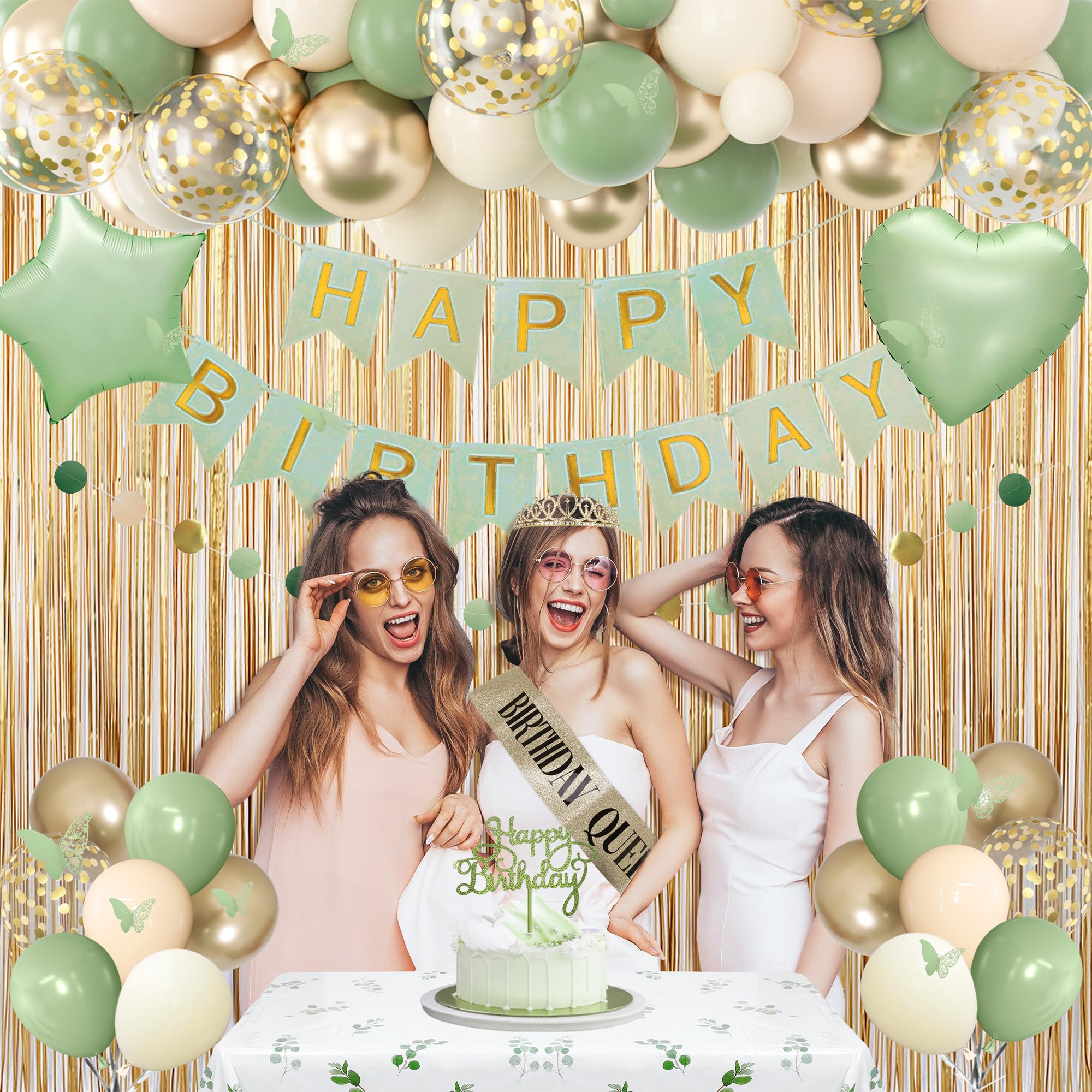 Sage Green Birthday Decorations: Our sage green party decorations kit includes 1 pcs eucalyptus leaves table cloth, 1 pcs birthday crown, 1pcs birthday sash, 2 pcs foil fringe curtains, 1 pcs happy birthday banner, 1pcs circle dots garland, 1 pcs cake topper, 12 pcs butterfly wall decor, 2 pcs 18" sage green heart and star foil balloons, 66 pcs 12" 10" 5" gold confetti/metallic gold/nude/ivory white/sage green balloons and 2 pcs balloon tools