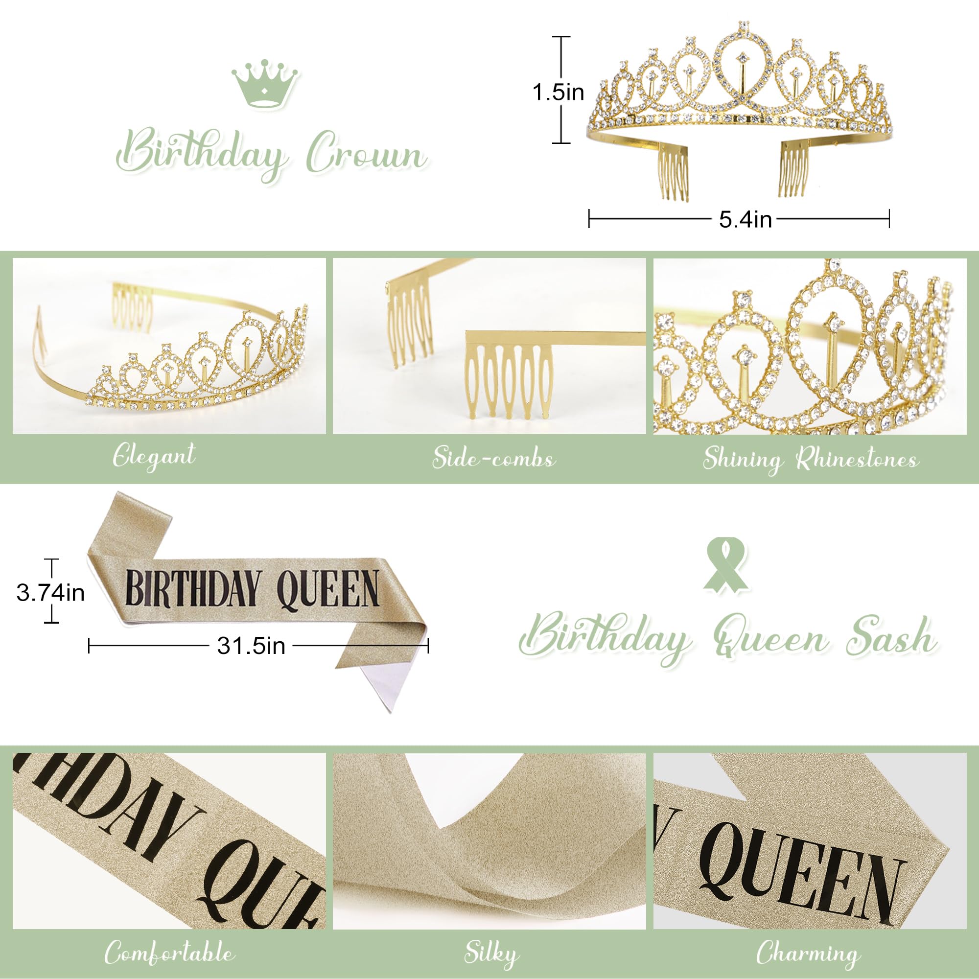 Stunning Birthday Sash and Tiara: A stylish eucalyptus leaves table cover provides glamour look for your green birthday decorations setup; A gorgeous sash that proudly declares birthday girl, along with a matching crown to make her feel like royalty on her special day