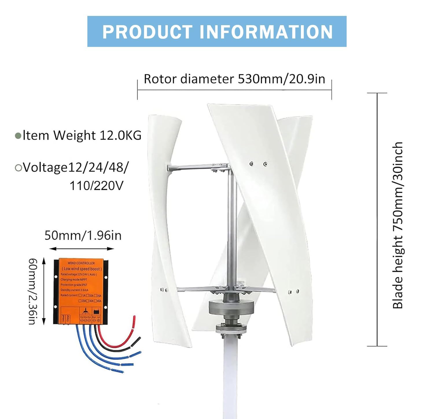 This eco-friendly and noise-free turbine converts wind energy into mechanical energy and electricity, making it an ideal solution for home use, surveillance systems, marine applications, and street lighting. Our compact and lightweight design ensures easy assembly, with clear, English instructions included. Please note that a mounting rod is not included; the turbine can be easily fitted onto a 48-54 mm (1.89-2.13 inch) rod, allowing for versatile installation options. Product Specifications: - Name: Vertical Wind Turbine - Color: Available in White and Tricolor - Number of Blades: 3 for enhanced stability - Wind Turbine Diameter: 530mm (20.9 inches) - Blade Height: 750mm (30 inches) - Rated Voltage: 12V/24V/48V - Maximum Power: 18,000W - Packaging Weight: 12kg - Initial Wind Speed: 2m/s - Rated Wind Speed: 10m/s - Safe Wind Speed: ≤40m/s - Generator Type: Permanent Magnetic Levitation Three-phase Motor - Recommended Installation Height: 2-12m - Generator Protection Grade: IP54 - Operating Temperature Range: -25 to +45°C - Overload Protection: Equipped with an Electromagnetic Brake Key Features: - The innovative 3-blade design provides superior rotational stability. - Efficiently captures wind energy to deliver substantial power output. - No fuel requirements, resulting in a pollution-free operation. - Designed for longevity, with an operational life of 10 to 15 years under normal conditions. - Crafted from high-quality alloys and fiberglass, ensuring durability and resistance to corrosion. - Versatile applications include home energy solutions, marine power needs, and outdoor lighting. Package Includes: - 1 * Wind Turbine - 1 * Controller - 1 * Installation Guide Harness the wind and transition to sustainable energy with our Vertical Wind Turbine, perfect for both personal and professional use.