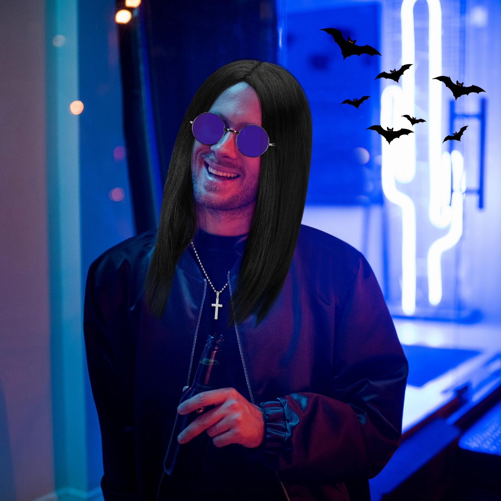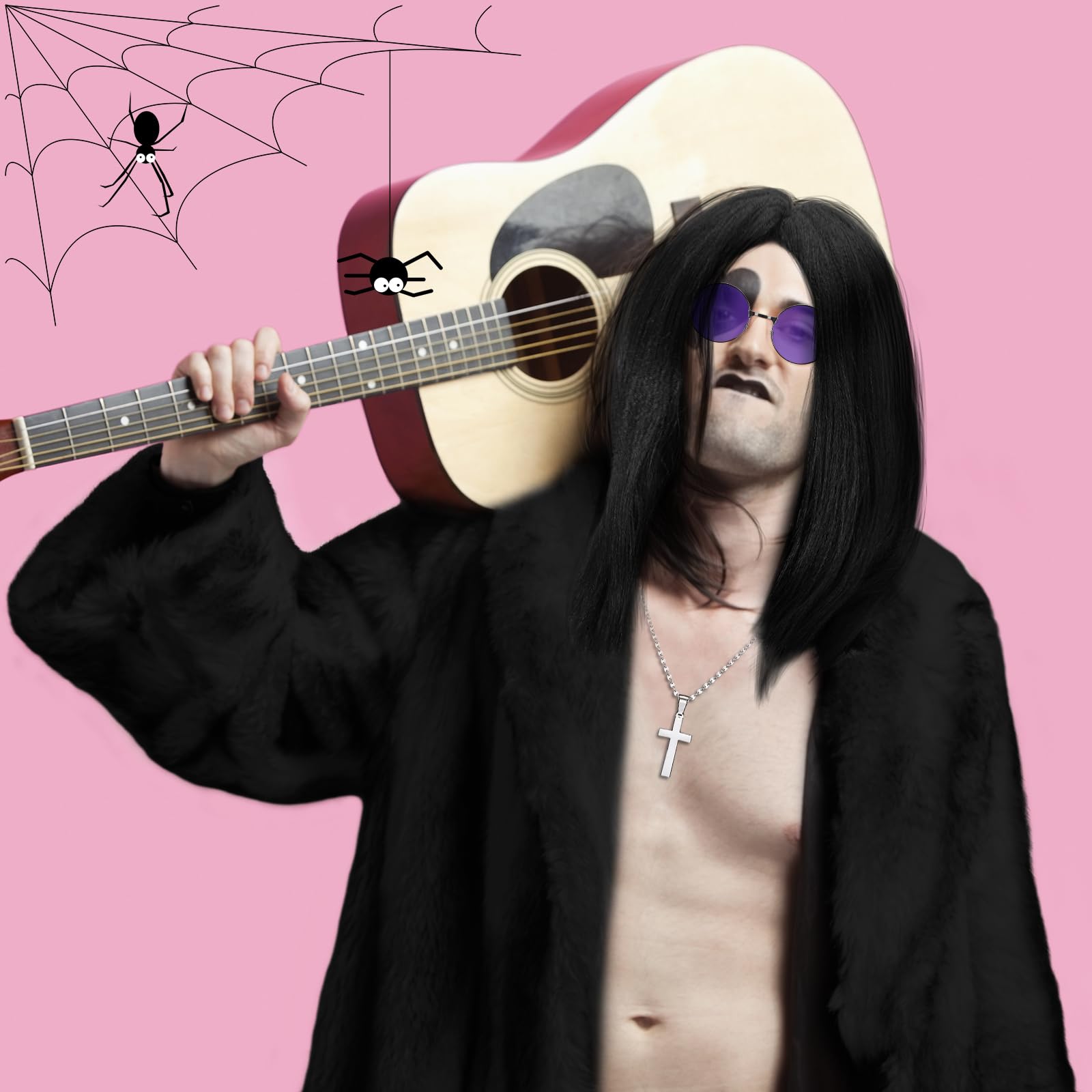 80'S Rock Men Look: embrace the appreciation of the 80's rock era with these cosplay party supplies; The wig, sleek cross necklace, and retro hippie glasses leave you looking like an actual rock men from the 80's, creating a nostalgic and authentic feel at your parties or events