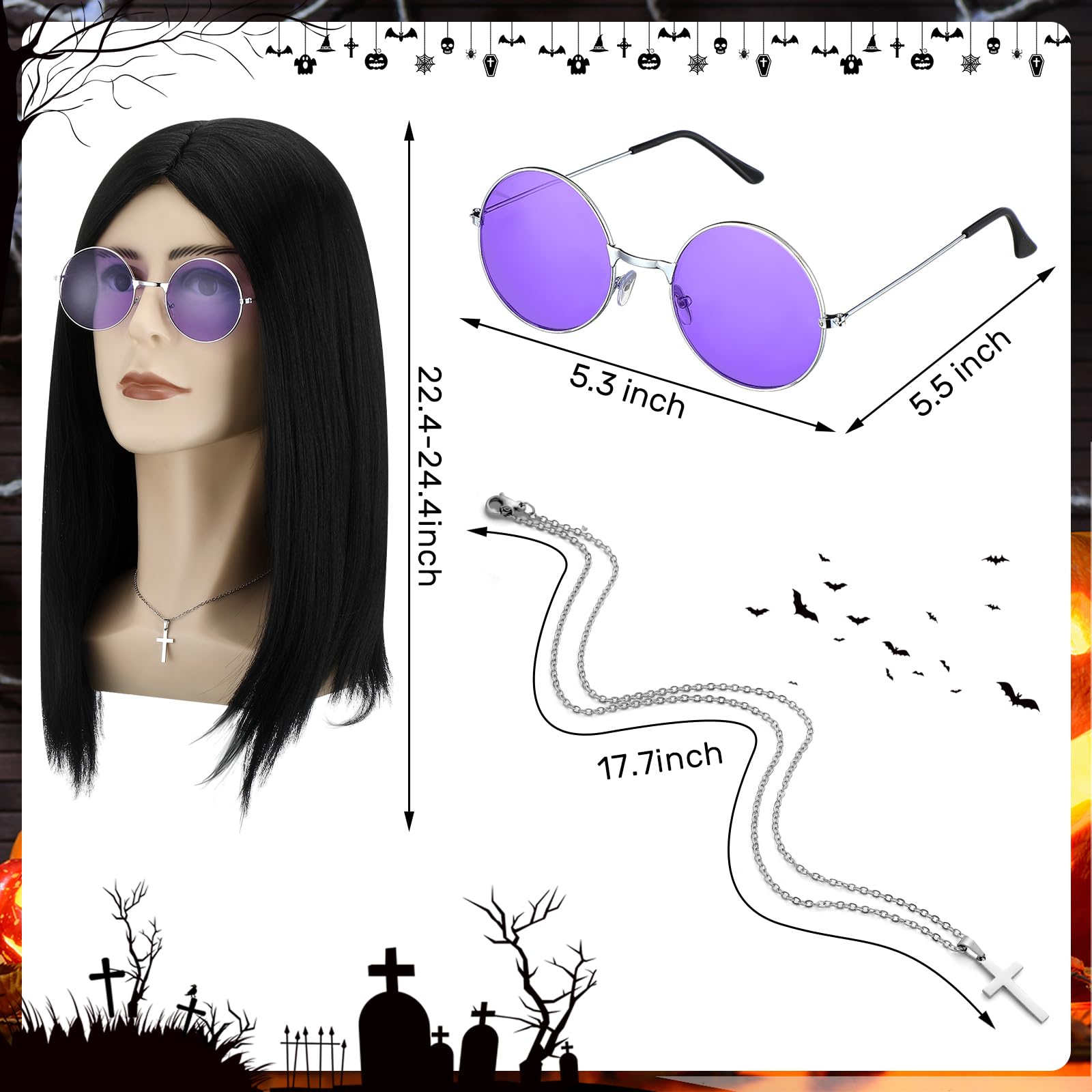 Features: Stylish and retro hippie glasses: Show your love for rock with these trendy purple round hippie glasses. These glasses are crafted from glass and titanium, ensuring they are both stylish and sturdy. They are designed in a universal size to suit anyone. Authentic and reliable: All these costume accessories are crafted from good materials, ensuring their long lasting and outstanding performance. Make your parties memorable with these reliable Halloween rock accessories, ensuring you have fun and worry about free time. Specifications: Men wig: high temperature wire Cross necklace: stainless steel Hippie glasses: glass and titanium Size: Men wig: about 22.4-24.4 inches long Cross necklace: cross about 0.5 x 0.87 inches Hippie glasses: universal size Package includes: 1 x Men wig 1 x Cross necklace 1 x Hippie glasses Notes: Manual measurement, please allow slight errors on size. The color may exist a slight difference due to different screen displays. If you use our products with your own necklace or pendant, please check whether the product is in good condition before use to avoid unnecessary loss of personal property.