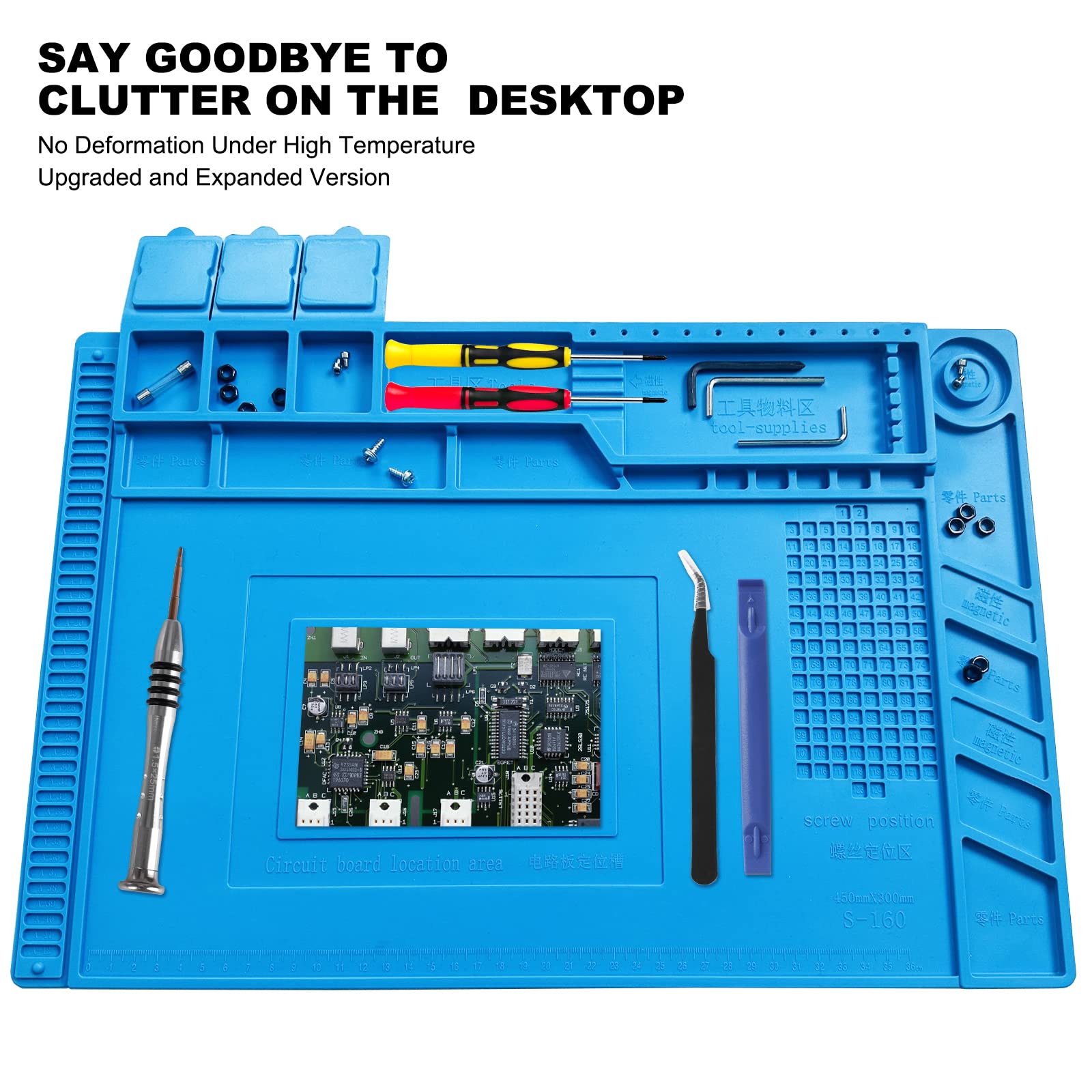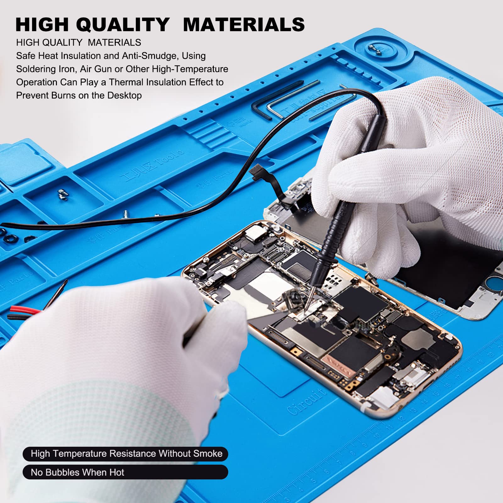 γHEAT AND ANTI-STATIC γ Solder pad can resist high temperature 932Β°F(500Β°C), at the same time has good heat dissipation and anti-static function, in the protection of your workbench will not be damaged at the same time can protect your line components will not be damaged