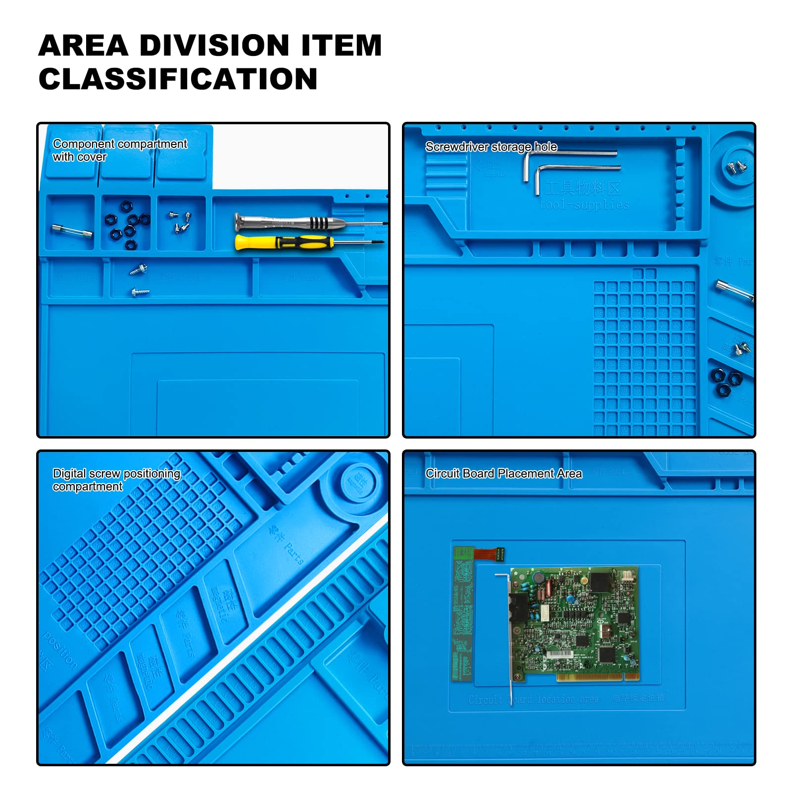 γLARGE SIZE AND MULTI-FUNCTION γ 17.7*11.8 Large size design, welding pad can provide a larger work space, to meet your multiple projects at the same time, multi-area design, make your maintenance more convenient
