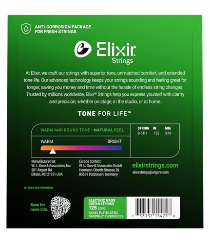 CONTENTS: 1x Single String Elixir Strings, Custom Electric Bass Guitar Strings, Nickel Plated Steel with NANOWEB Technology, Longest-Lasting Tone, 5th String Single, Long Scale, Super Light B 125