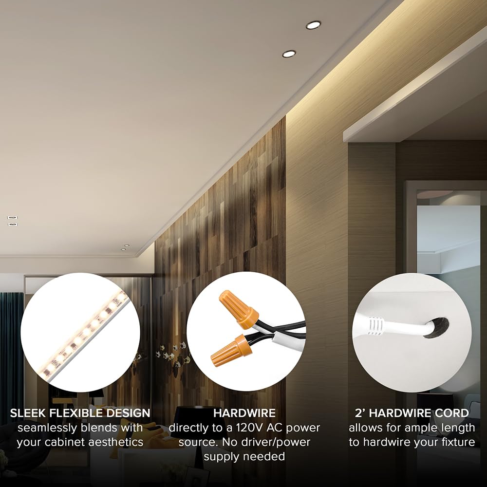 Stable and Lasting Installation- Designed for longevity, the hardwired connection ensures secure and permanent installation, providing consistency. Easily install this cove light to a 120V power source (direct line voltage) and attach to cabinets with the provided screws and mounting clips.