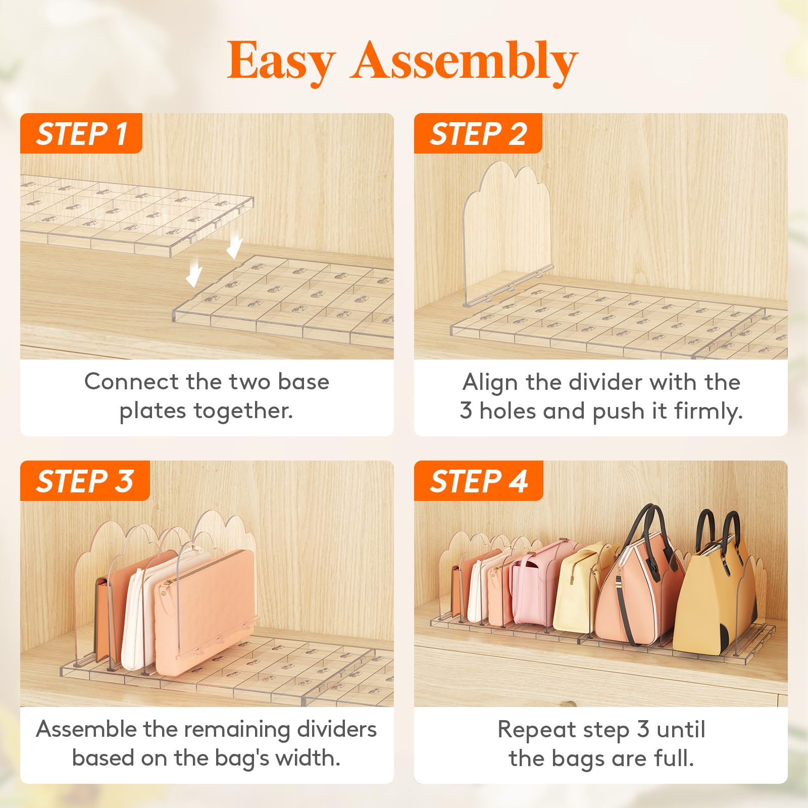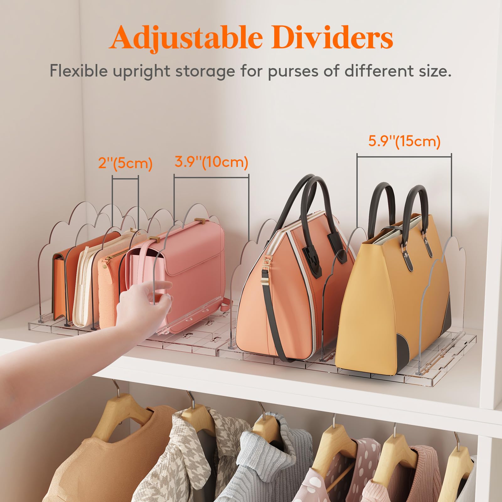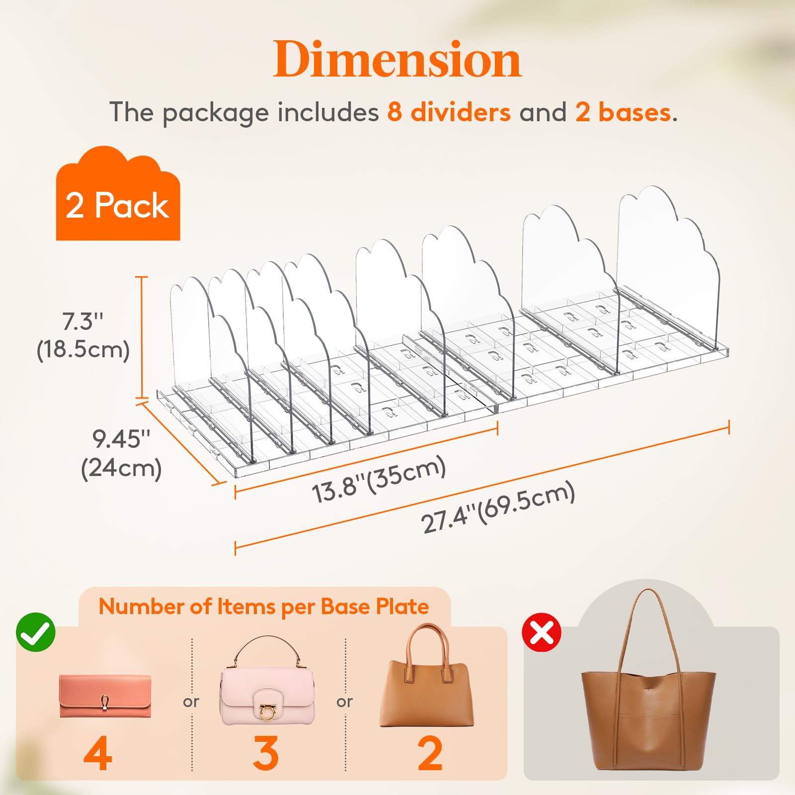 Adjustable Dividers: Includes 2 bases and 8 dividers for customizable spacing; overall size 27.4" × 9.45", max height 7.3". Ensures handbags stand upright to prevent deformation. Perfect closet organization for purses and handbags