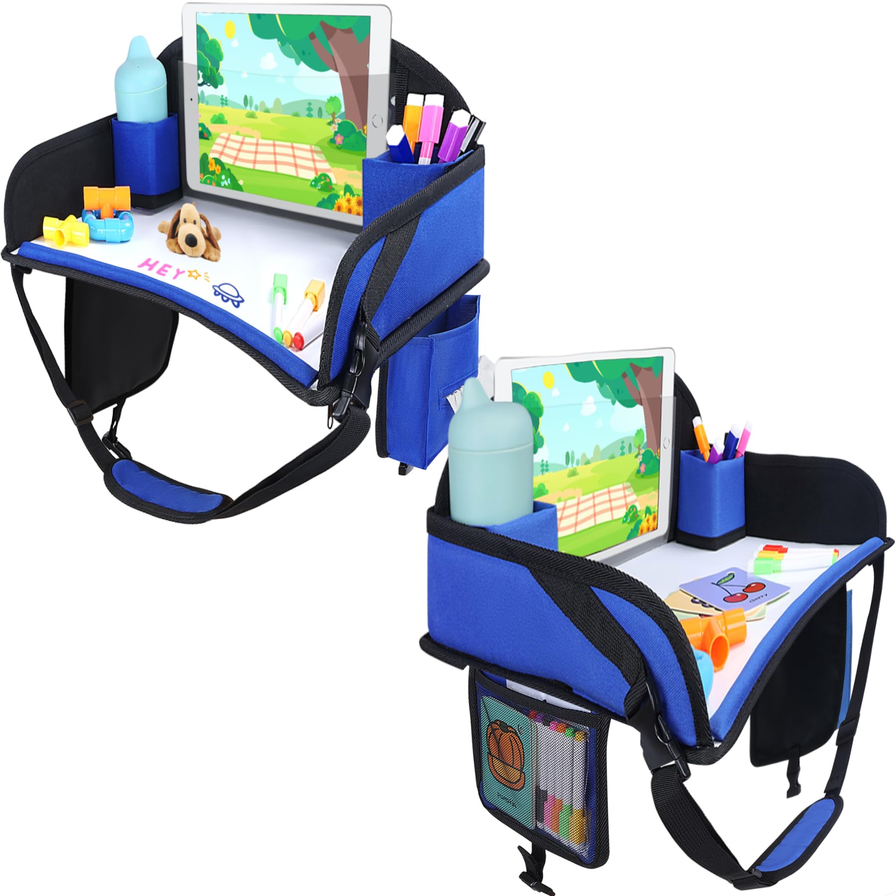 Multi-Function Travel Tray For Kids Car Seat: Our car tray for kids features convenient organizational pockets to hold your kids small cards, and a built-in portable tissue holder for easy access. The car seat tray also includes a cup holder, keeping drinks within reach, while the raised edges prevent snacks, pens, or toys from falling off. More than just a wipe-clean drawing surface, car seat tray doubles as a snack tray—so kids can eat and play without switching spots!