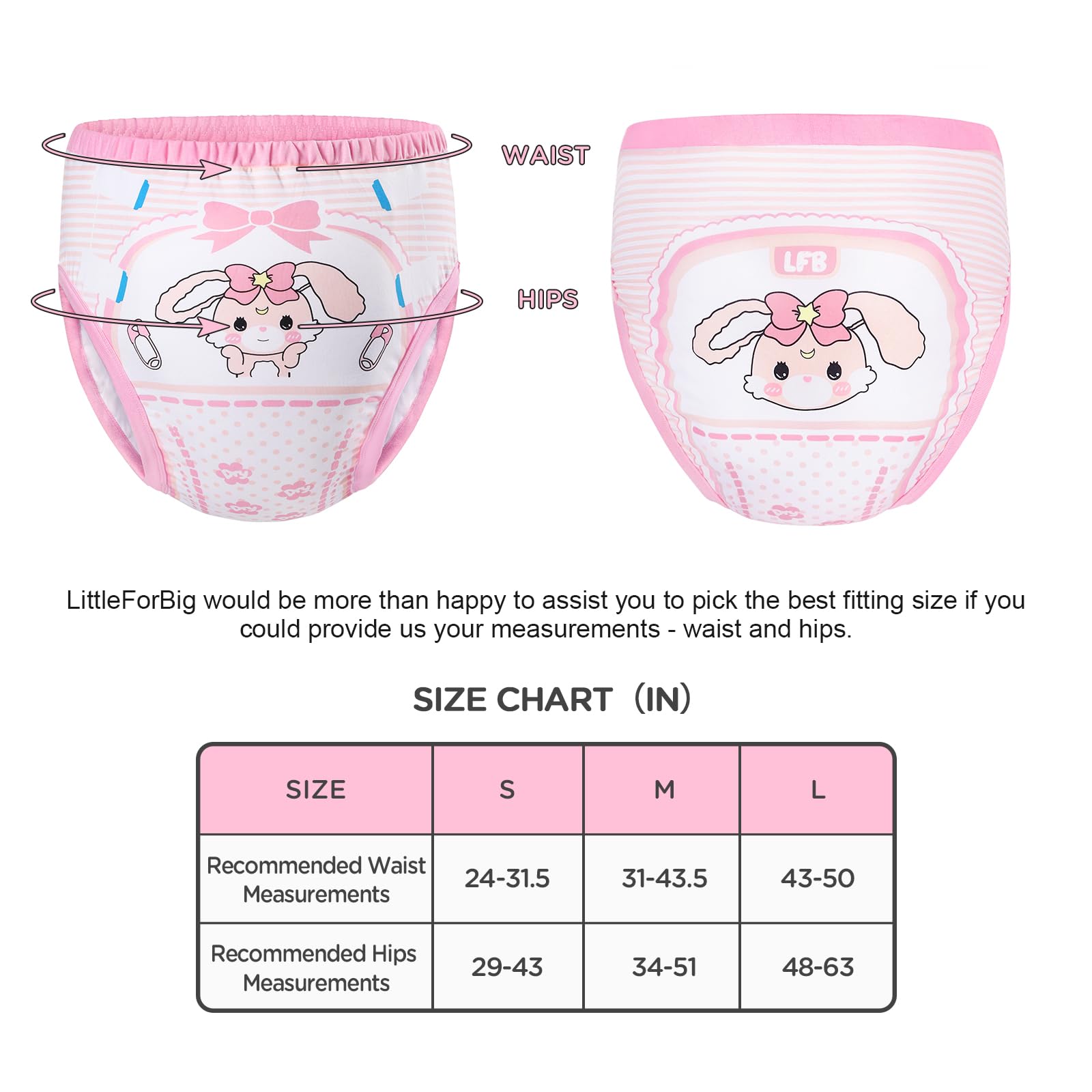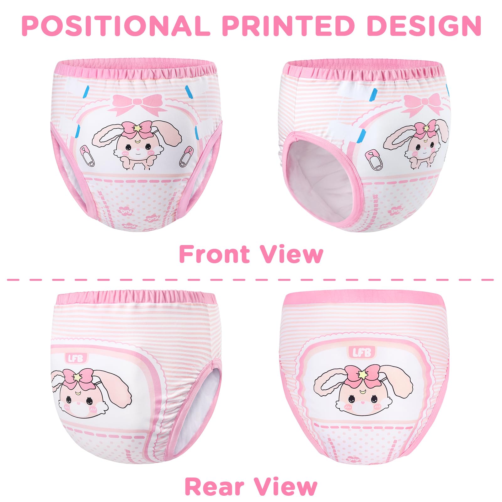 Stylish and Innovative Design: Embrace the charm of our pink training pants, featuring a big, bold 'Baby Usagi' pattern on the front and back. With LittleForBig cute diaper designs, these training pants bring a playful touch to your daily routine. The pretty and cozy look ensures you can feel confident and comfortable while enjoying the fun and charm of Baby Usagi Training Pants!