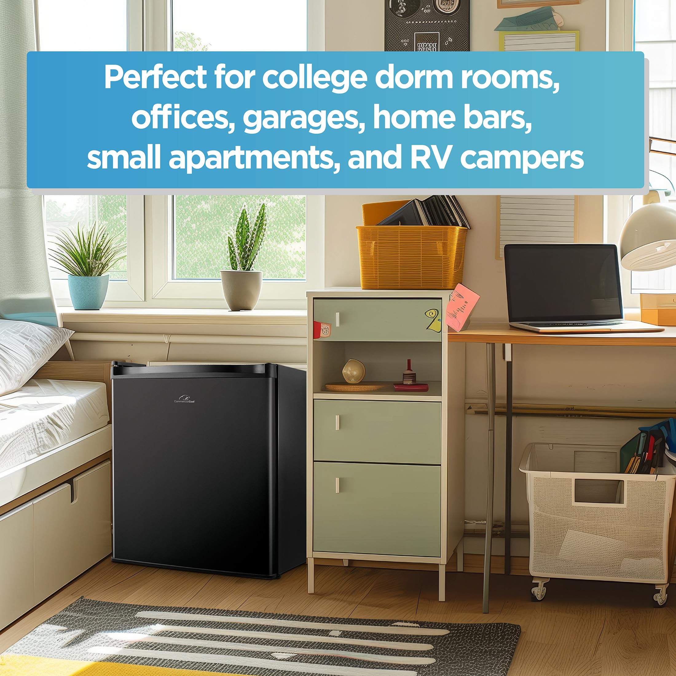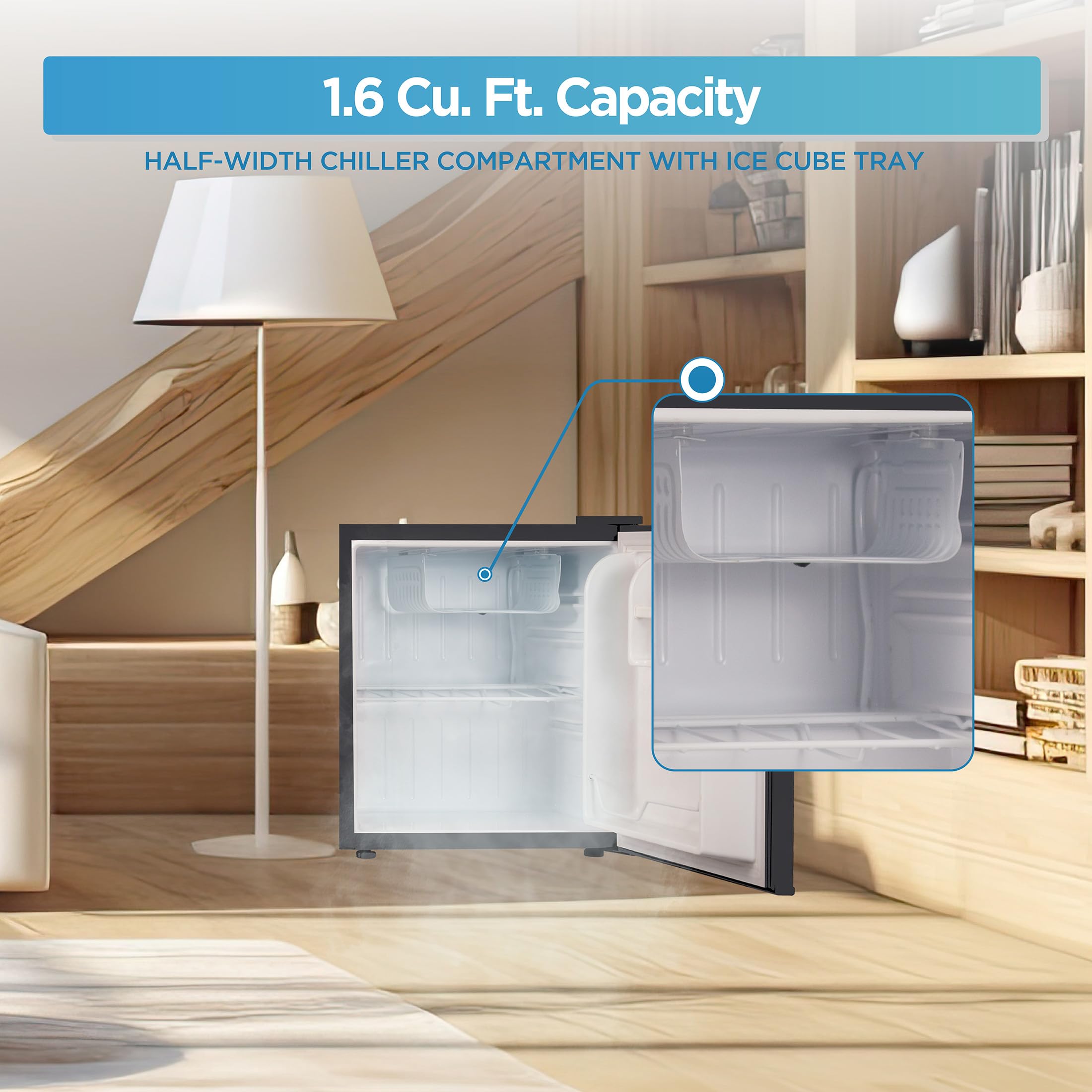 Compact Design: This 1.6 cu. ft. compact refrigerator is a perfect mini refrigerator for small spaces, offering a sleek design with a recessed door handle, making it ideal for dorms or offices