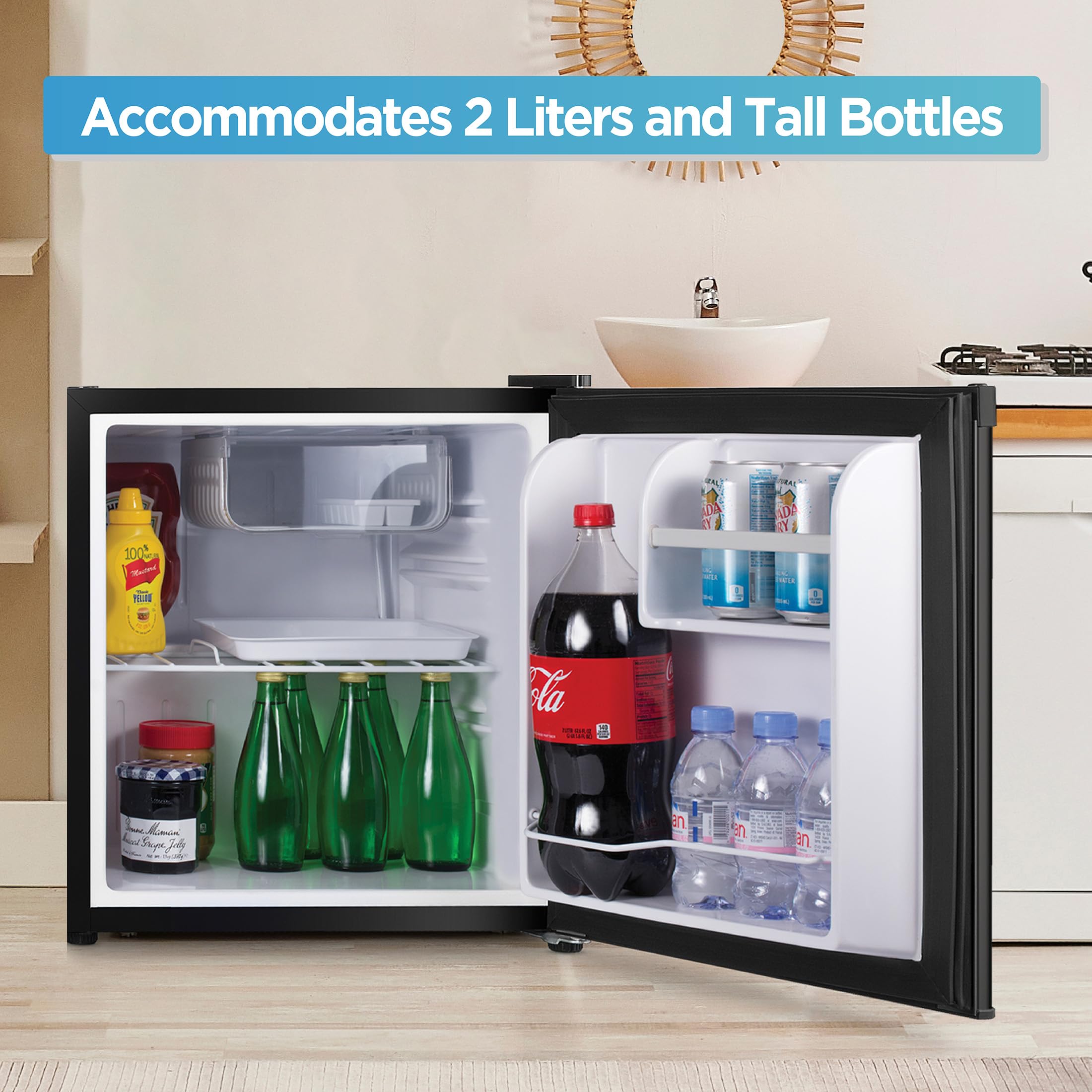 Convenient Door Storage: The door of this mini fridge with freezer includes one full-width and one half-width shelf, accommodating a 2-liter tall bottle, ideal for small refrigerator for office use