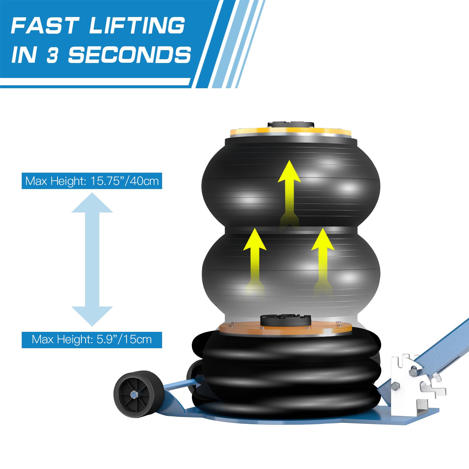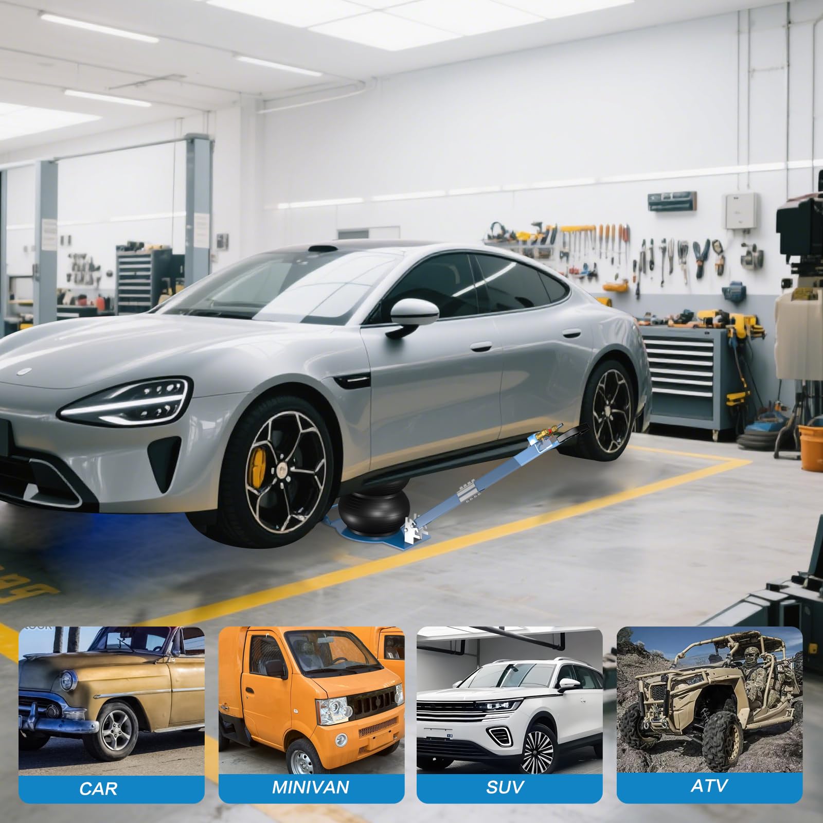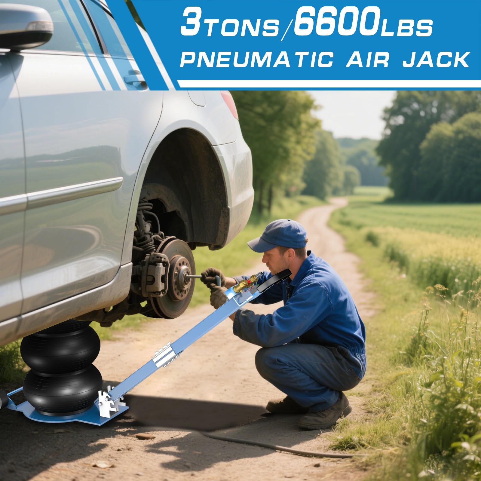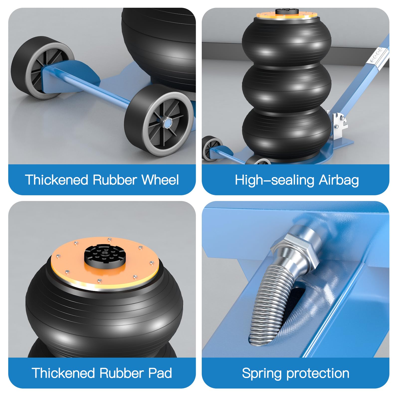 【Durable and Long-lasting】Our air jacks are made of high-quality materials, and the top of the air jack has thickened anti slip rubber pads to increase the contact area.The overall use of anti-oxidation spray paint and matte baking paint prevents rust and corrosion. The air jack has three layers of thickened airbags, which have stronger pressure resistance and are a reliable assistant for your car maintenance.