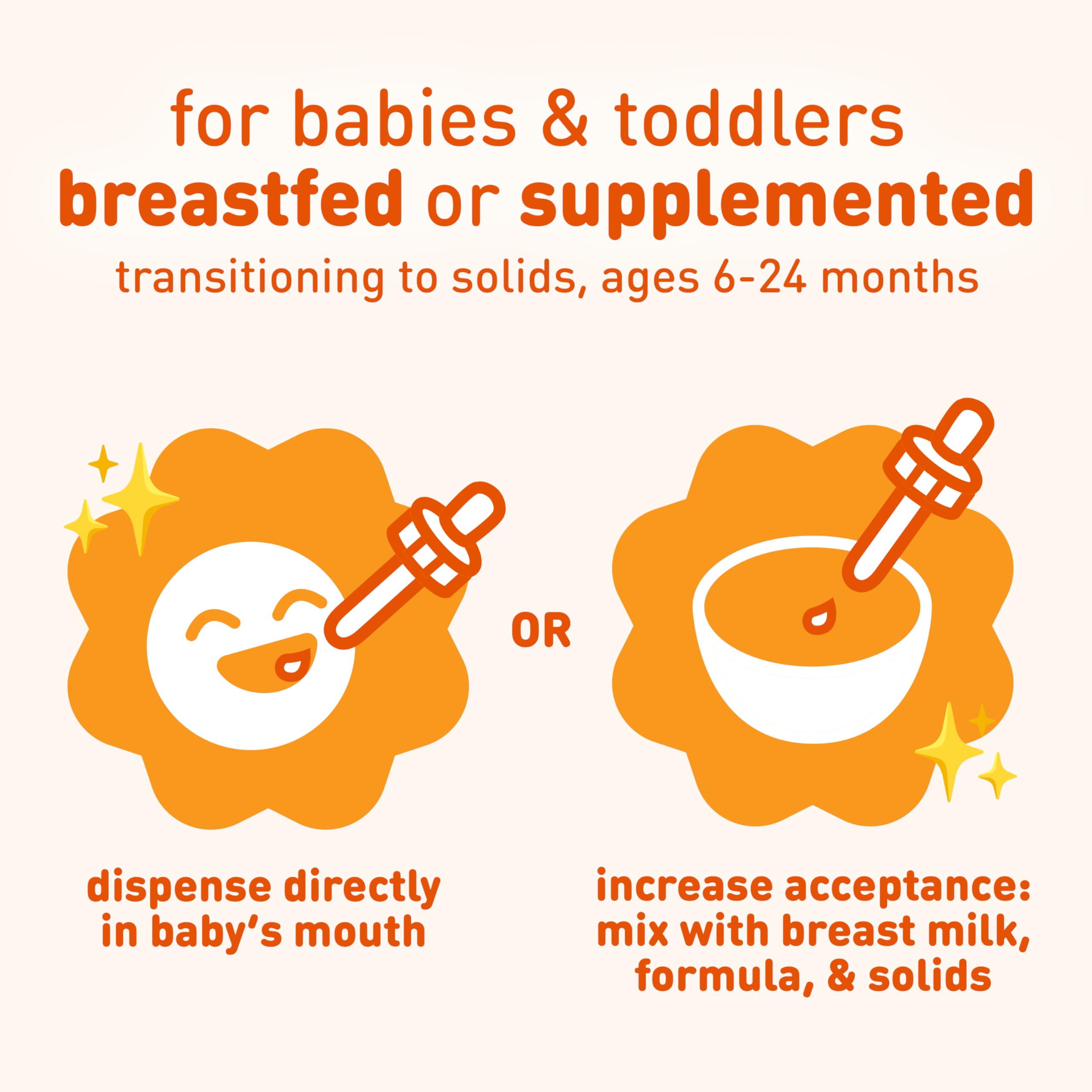 FORMAT and USAGE: Easy to use dropper dispenses directly into the mouth or can be mixed with other foods (breast milk, formula, juice, cereal etc.) to increase acceptance; 50 uses for 50 ml