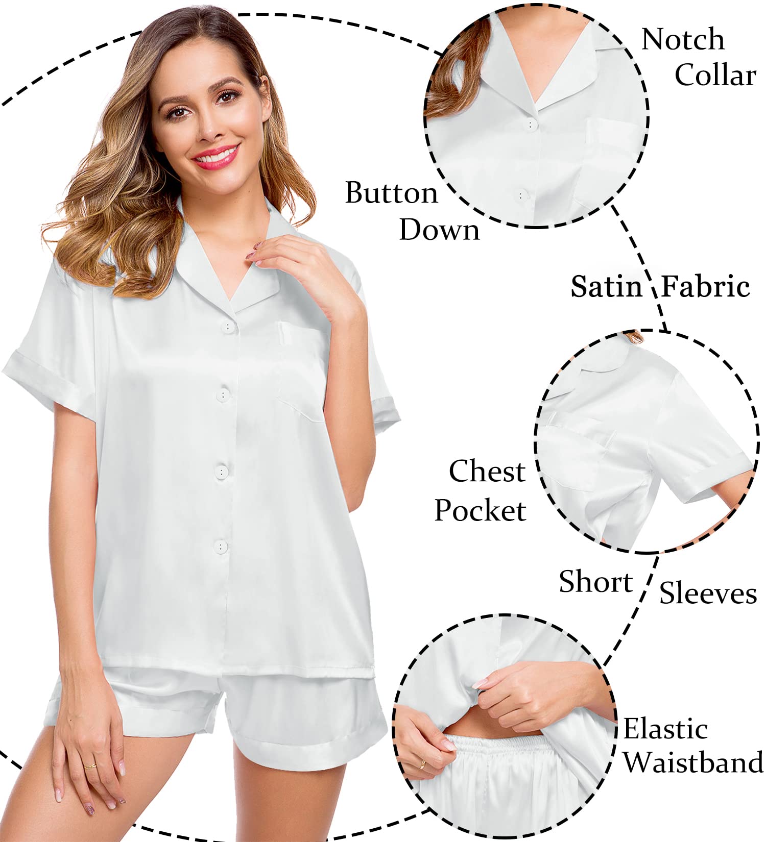 ❤ MATERIAL: This lightweight silk pajama set for women is made of premium 95% Polyester and 5% Spandex satin fabric. Super breathable, soft, smooth and skin-friendly.The sleepwear makes you comfortable in the lounge and sleeping time.