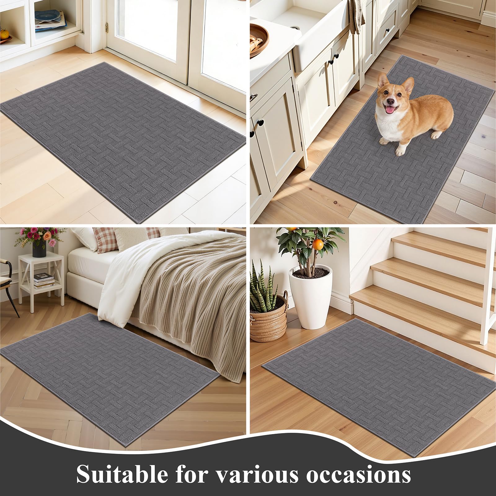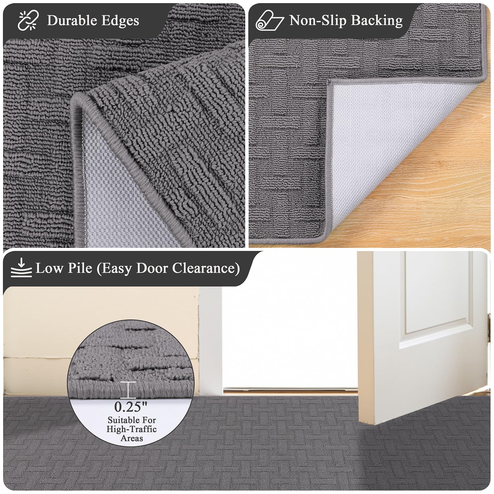 Low-Profile Welcome Mat: The absorbent runner rug measures 0.24 inches in thickness (6mm). The low design prevents the doors or feet from getting stuck, the door will go over this rug easily, convenient for you to open or close the door. The stitching of the edges is double-layered technology, which is sturdy and practical, very durable and not easy to crack. Perfect for both indoor and outdoor use.