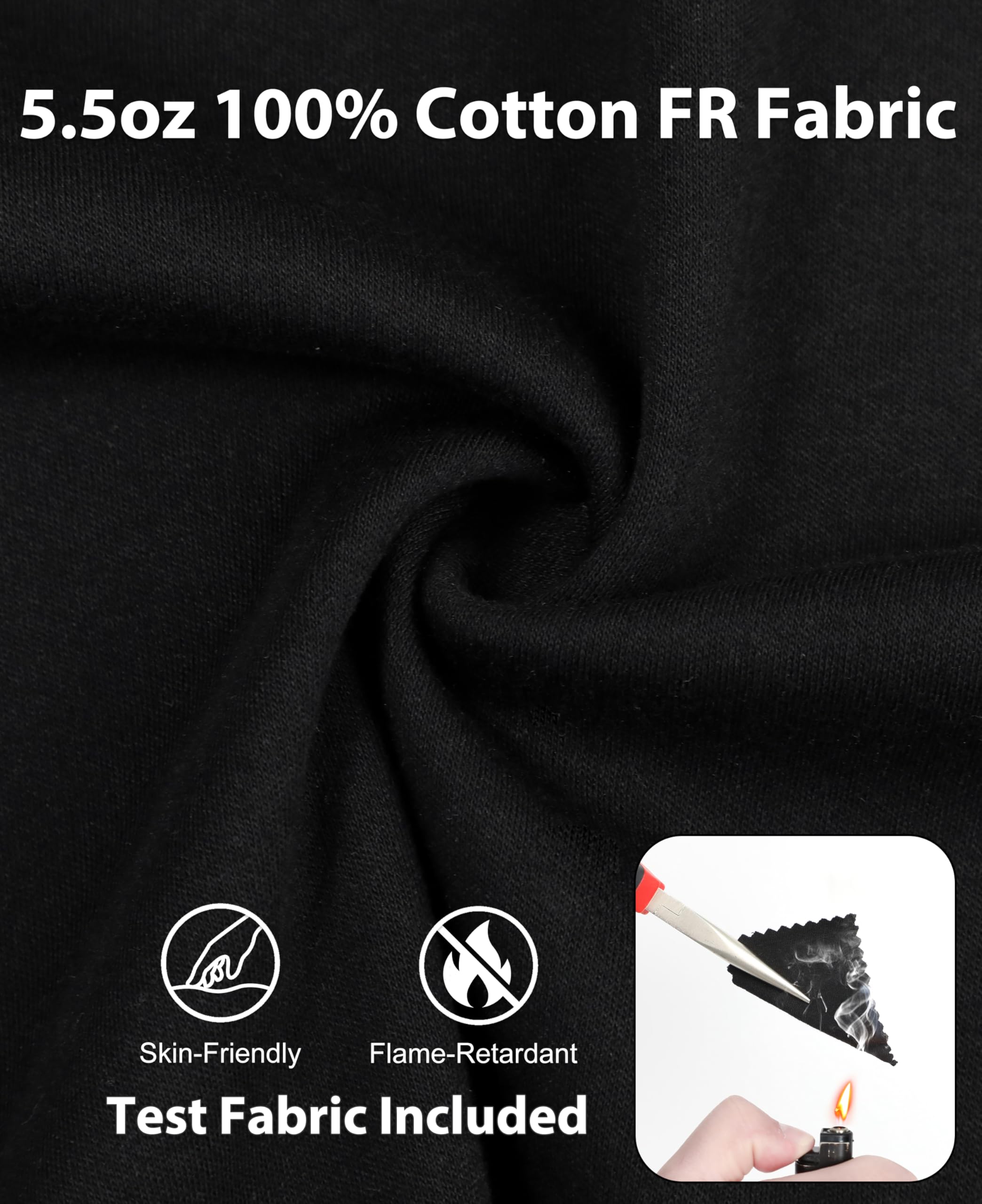 FR MATRIALS:5.5OZ cotton knit FR treated,FR buttons,FR sewing threads!Clear FR tag on arms and bottom front.