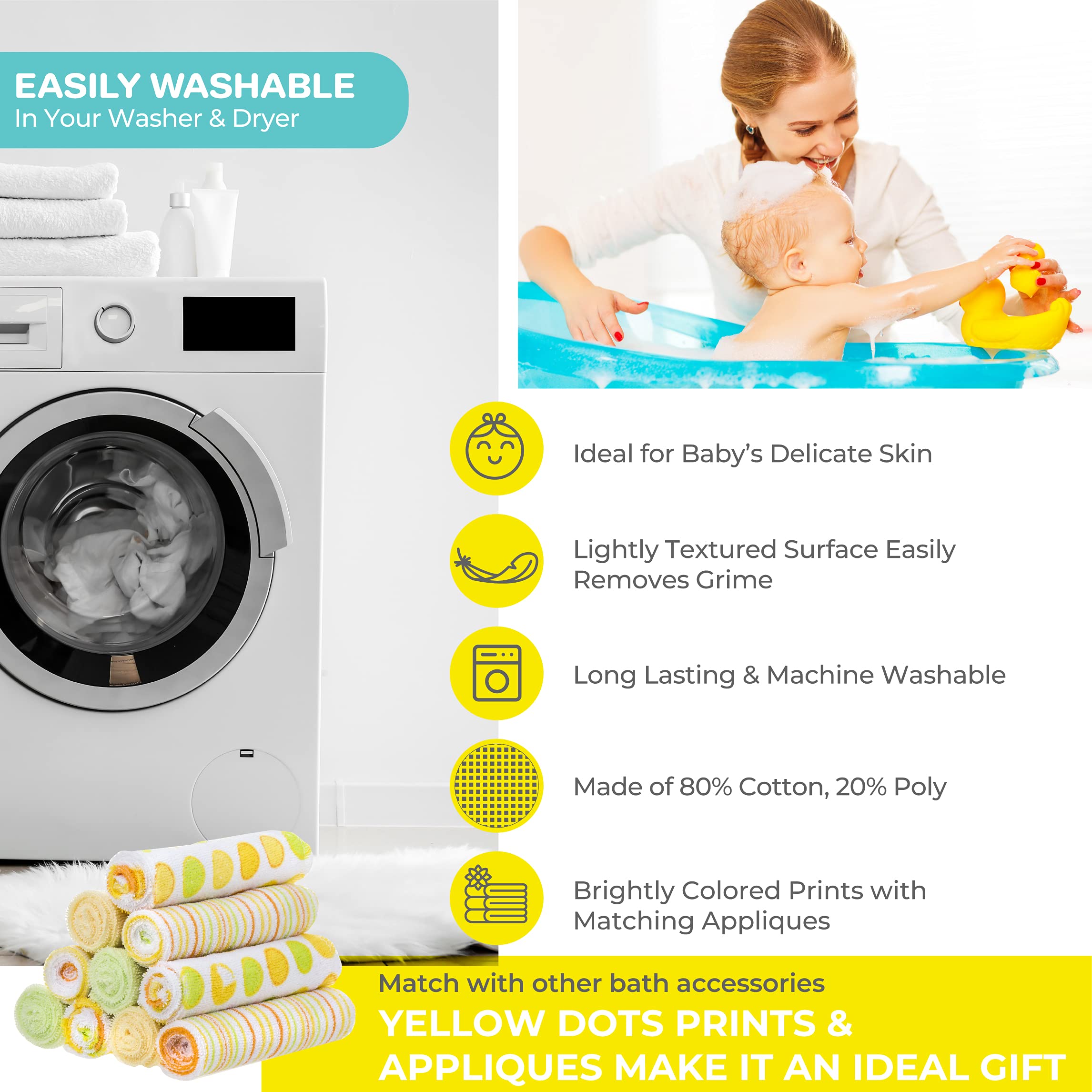 Size and Other Details: The yellow washcloths measure 9” x 9”, which is the perfect size for all your cleaning needs. The baby towels are made of 80% cotton and 20% poly, and a machine washable