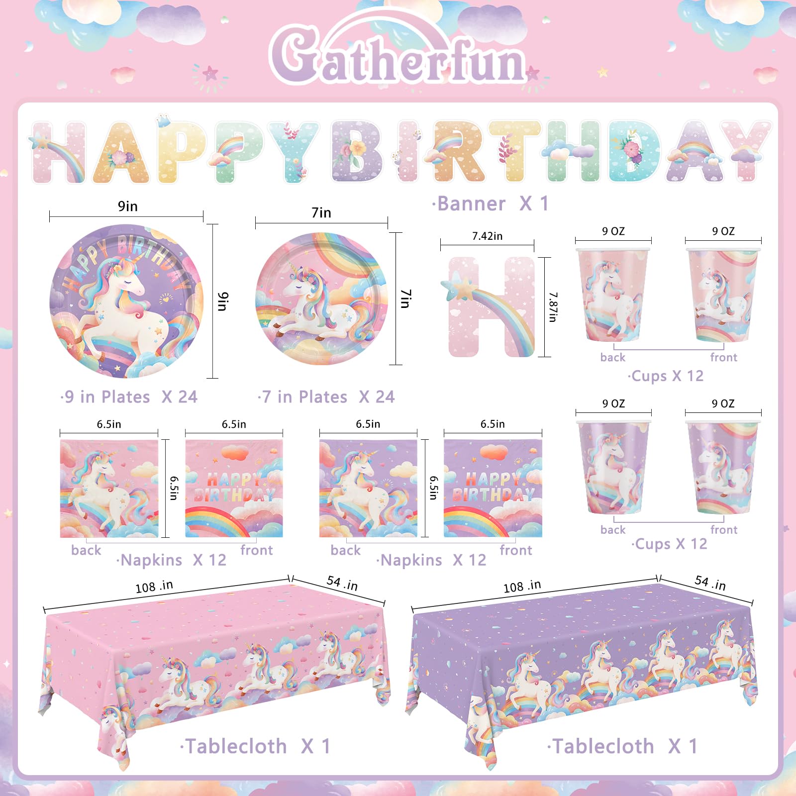 Unicorn-Themed Feast: Create a magical dining experience with our Unicorn Party Supplies, featuring 24 x 9" paper dinner plates, 24 x 7" dessert plates, 24 cups 9 oz cups(mix 2 designs), 24 paper napkins(mix 2 designs), 2 vibrant disposable tablecloths(mix 2 designs), and a celebratory banner. Perfect for elevating your unicorn birthday decorations and leaving guests spellbound!