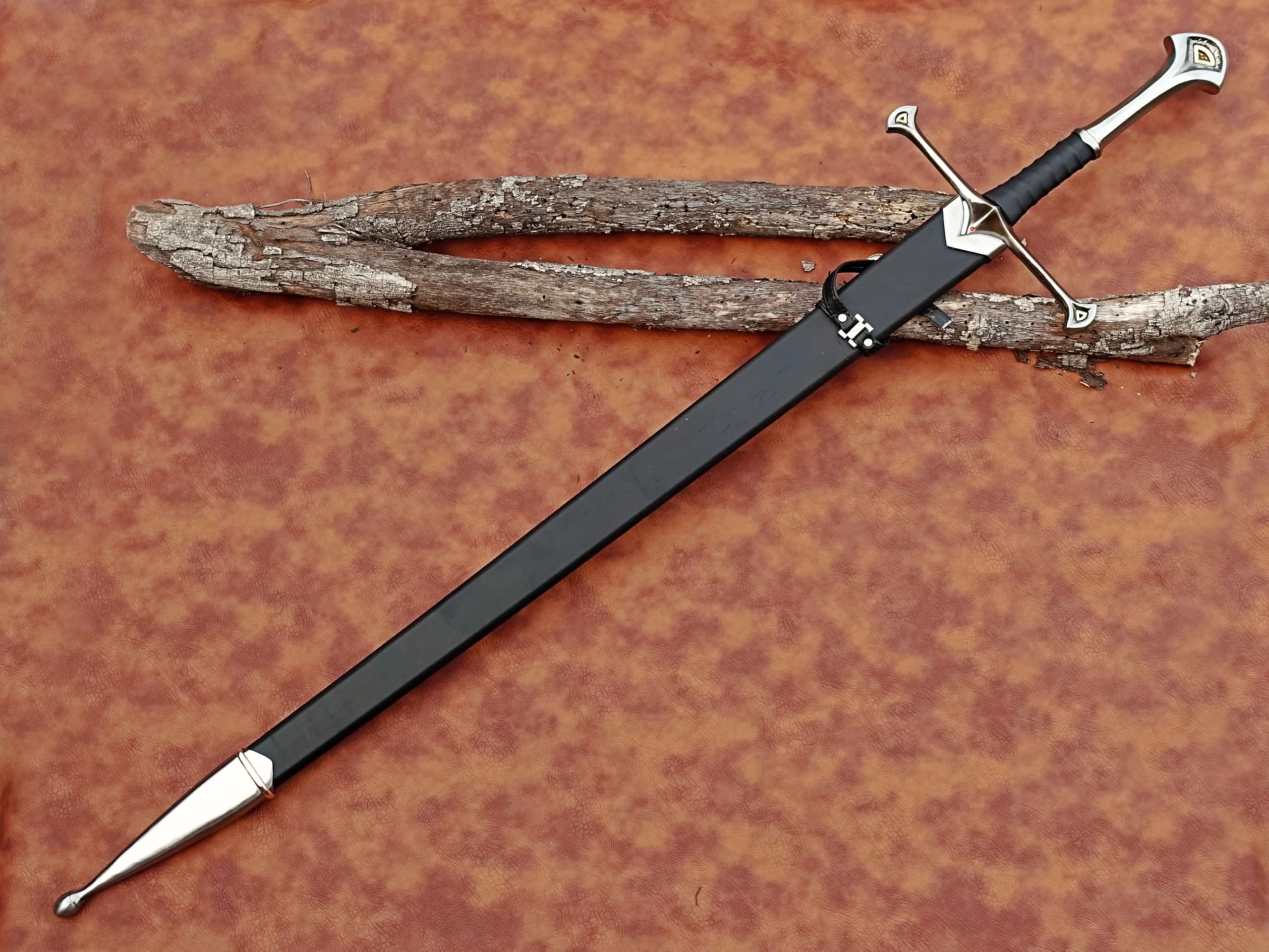 Exquisite Design: This sword measures 43 inches in total length, featuring a 30-inch unsharpened mirror-polished premium stainless steel blade, making it a formidable piece in any swordsman's collection. The handle is wrapped in leather, providing a no-slip grip. The sword also features an antique solid cast metal cross guard and pommel with simulated gemstones.