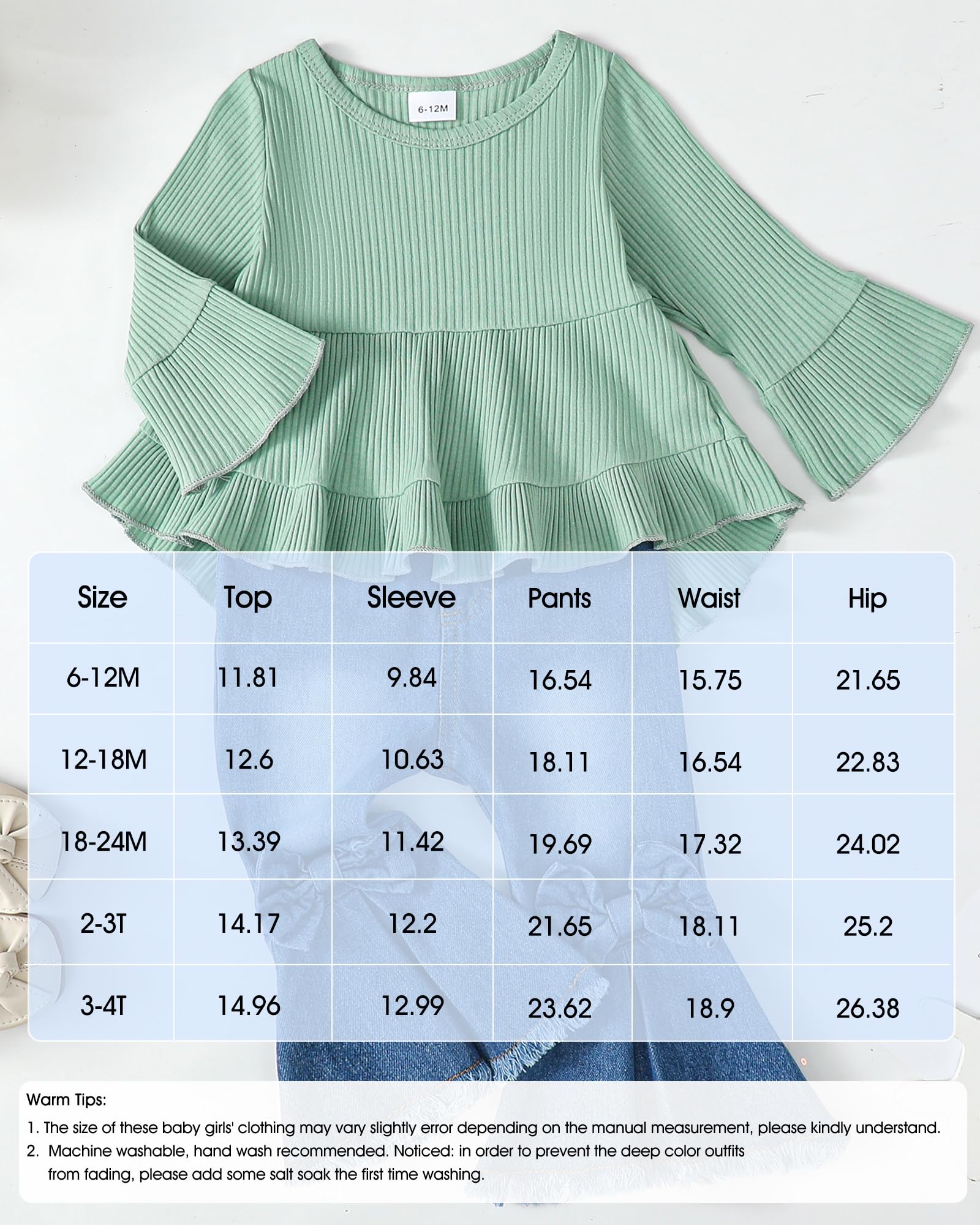 Package includes 1pc long sleeve shirt + 1pc baby girl pants.