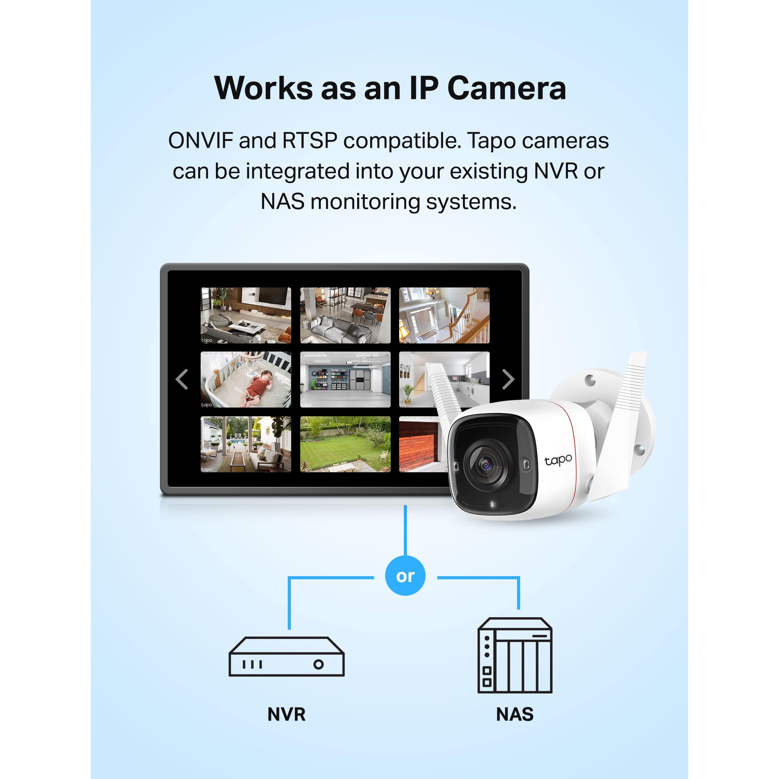 Designed and built for your family's safety and your convenience, the Tapo Smart Outdoor Security Wi-Fi Camera with 24/7 Recording C320WS will keep AI-enhanced watch over your outdoors. Featuring ultra-clear 2K 4MP QHD resolution video rest assured that no details of faces or objects will be missed. Even at night, the dual-integrated spotlights and starlight night sensor work together to provide high-resolution and full color night vision so nothing can hide in the dark, and an integrated IR sensor enables long distance night vision up to 98 feet away. Crisp 2-way talk quality is accessible anytime at the push of a button, and you can also trigger the built-in speaker to play a siren to ward off intruders. Using advanced AI algorithms, get notifications that matter with person, pet, and vehicle detection, or create custom activity zones near vulnerable areas like windows to get immediately notified someone is there. Deploy the outdoor security with peace of mind because camera is truly weatherproof with its IP66 rating, protected from harsh rains and particles. Compatible with Amazon Alexa and Google Assistant, you can stream using Echo Show or Google Chromecast. (2 year warranty).