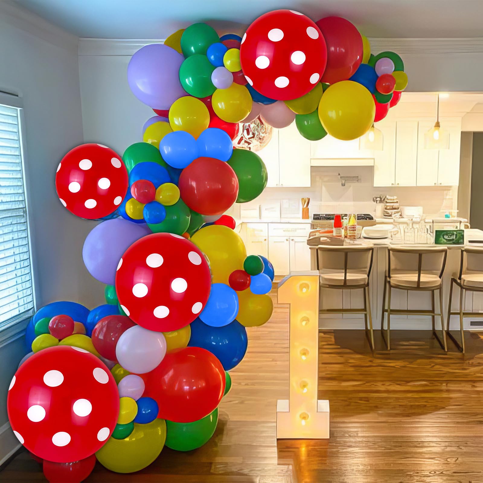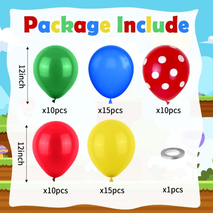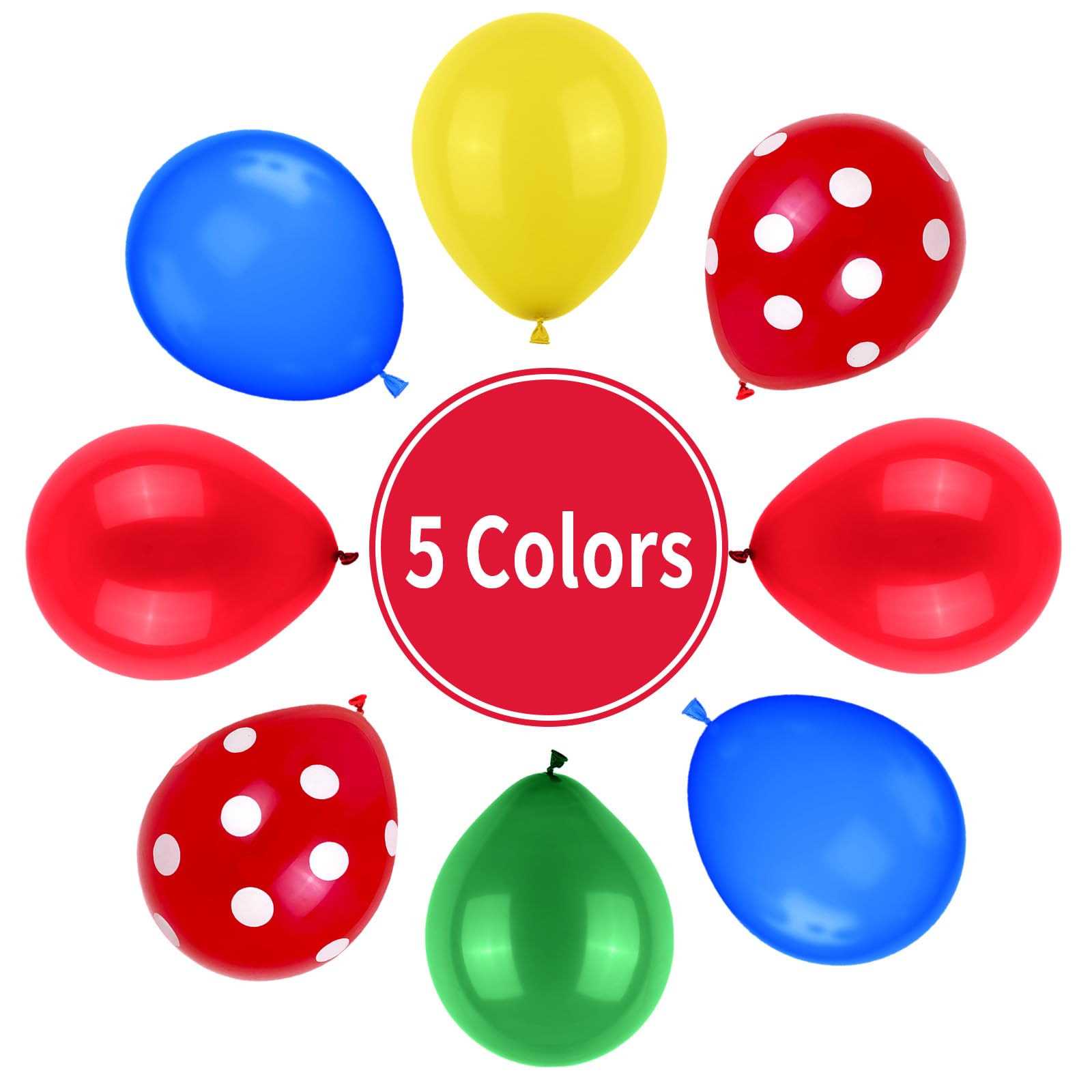 【12Inch Party Balloons Set】: The Red Yellow Blue balloons set includes 15pcs matte yellow balloons, 15pcs matte blue balloons, 10pcs matte red balloons, 10pcs matte red polka dot balloons, 10pcs matte dark green balloons, 1pc silver ribbon. 61pcs in total. Elevate your celebrations with our birthday party balloons!