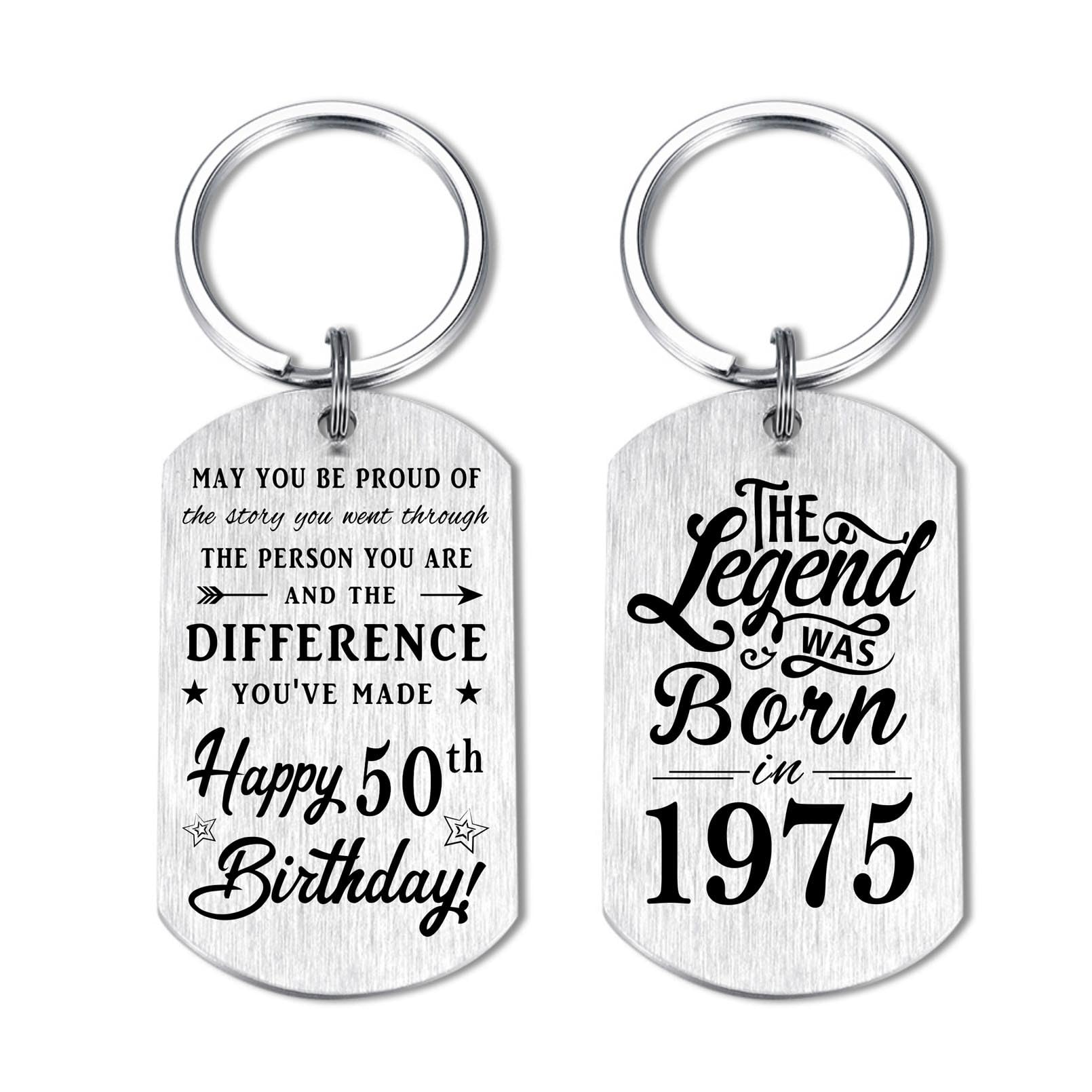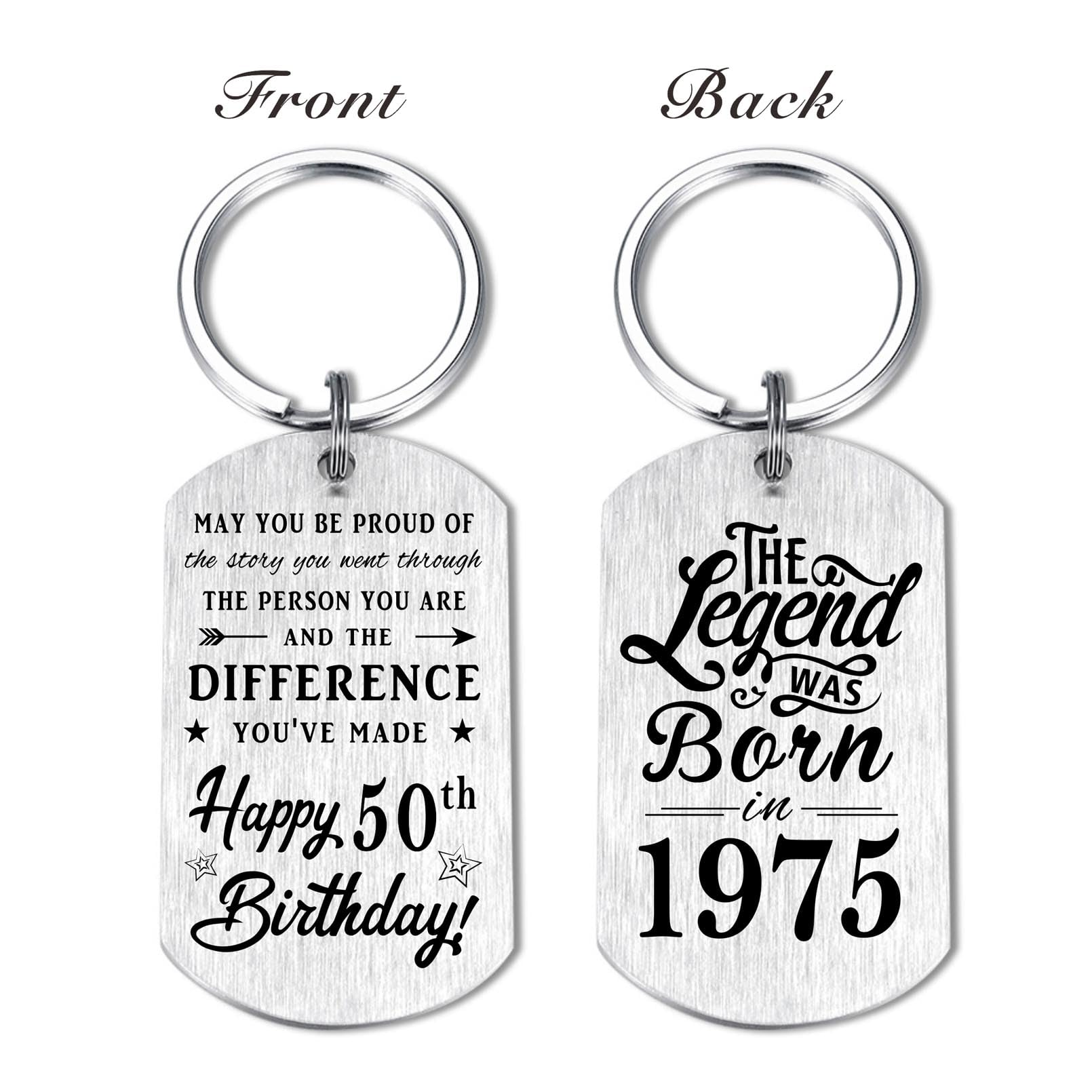 50th Birthday Gifts - With the unique design keychain to celebrate a loved one 50th birthday with a trip down memory lane. The fifty years legend story he/she has gone through is the most popular and amazing.