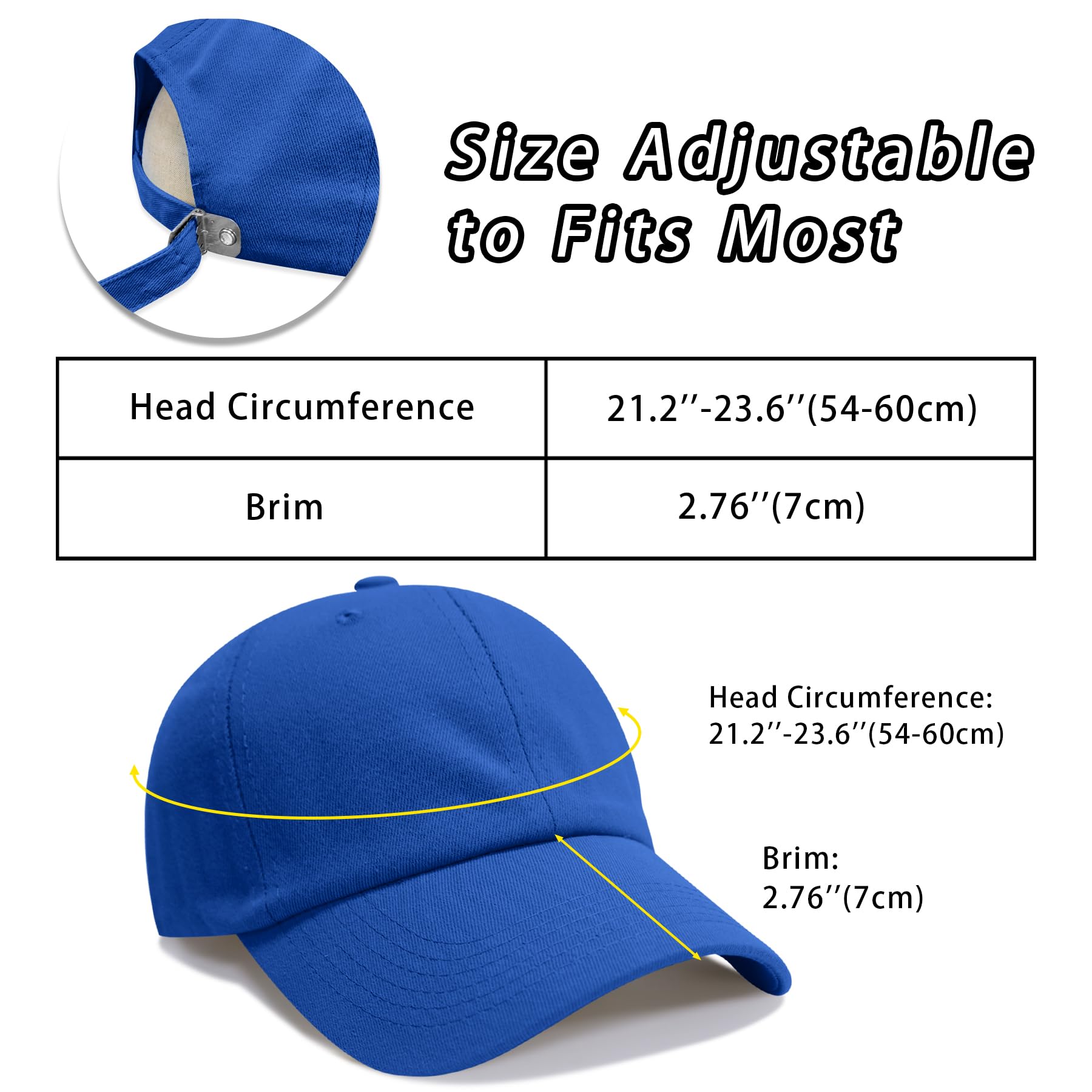 Description Low Profile UNCONSTRUCTED Plain baseball cap, classic and timeless style. The hat is comfortable for you to wear when doing activities Adjustable Size - One Size Fits Most: There is an adjustable button on the back of the baseball cap, which can be adjusted to a fitted size(21.2”-23.6”), the brim of the hat is 2.76”. Rear opening design fits women's low ponytail comfortably Adjustable metal button back closure, great fit for most head sizes ensure comfort at all times. The baseball cap is lightweight and has tightly stitching and can be used for more time The baseball cap is a stylish minimalist design, it is suitable for both men and women, comfortable and breathable, and easy to wear Wide Applicable Occasion: The unisex design makes it fits for men and women for everyday, sports, fishing, travel, outdoor activities, outing, etc