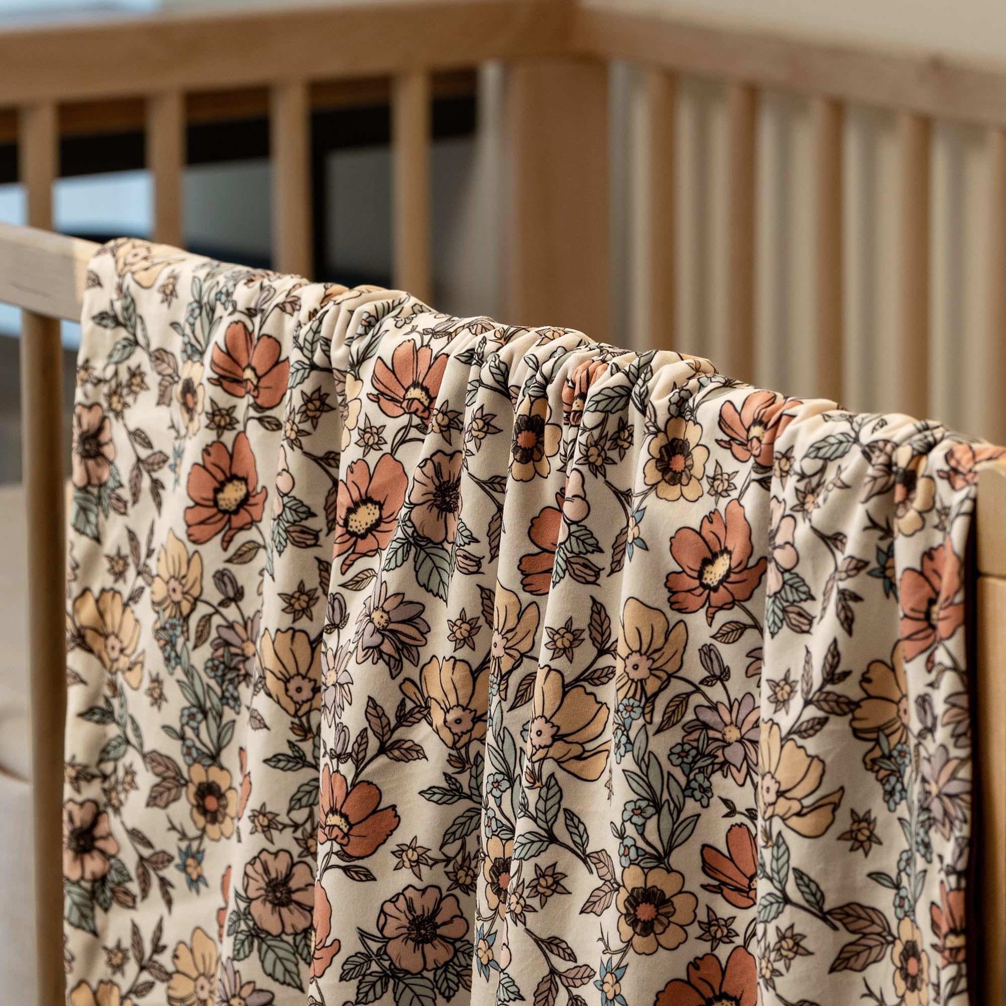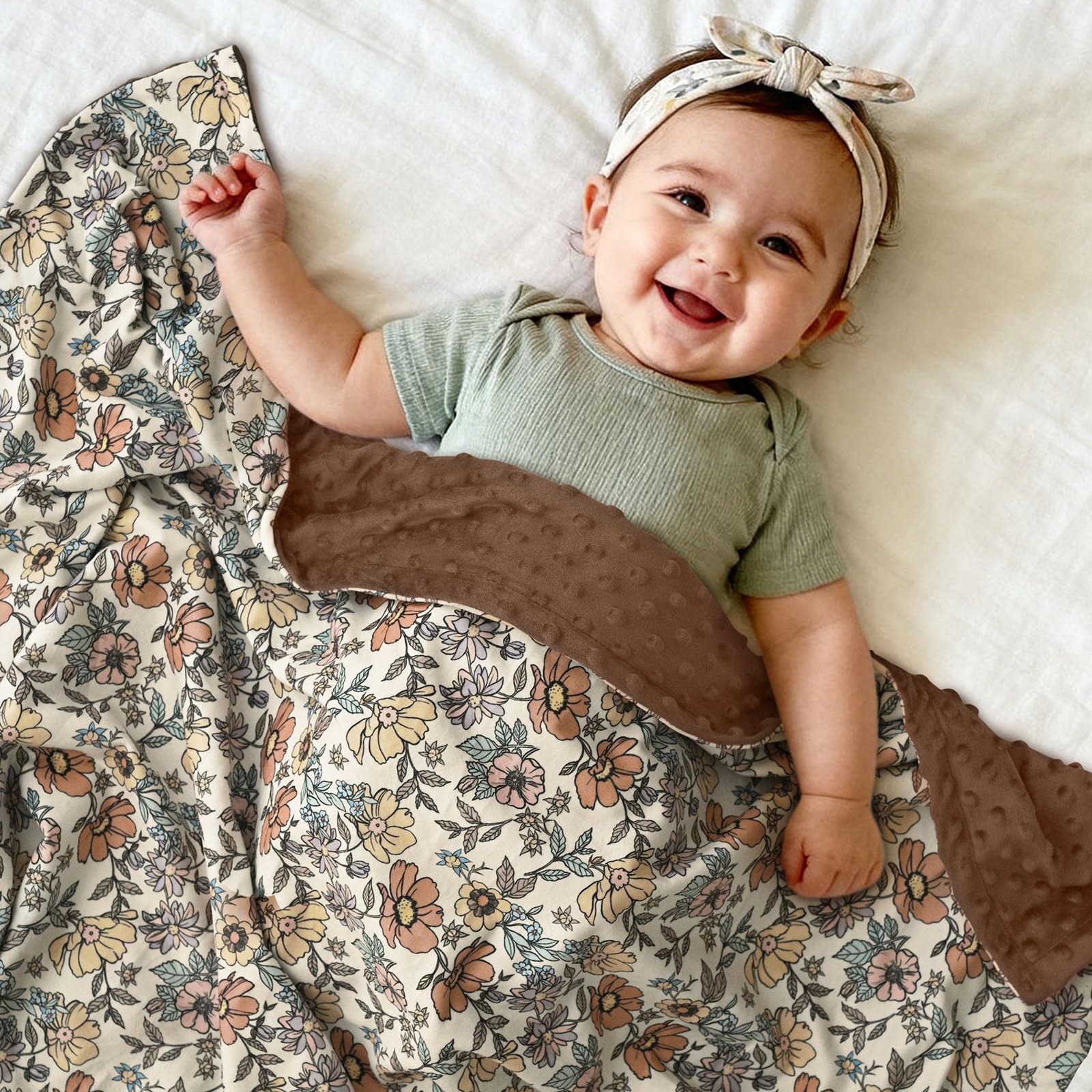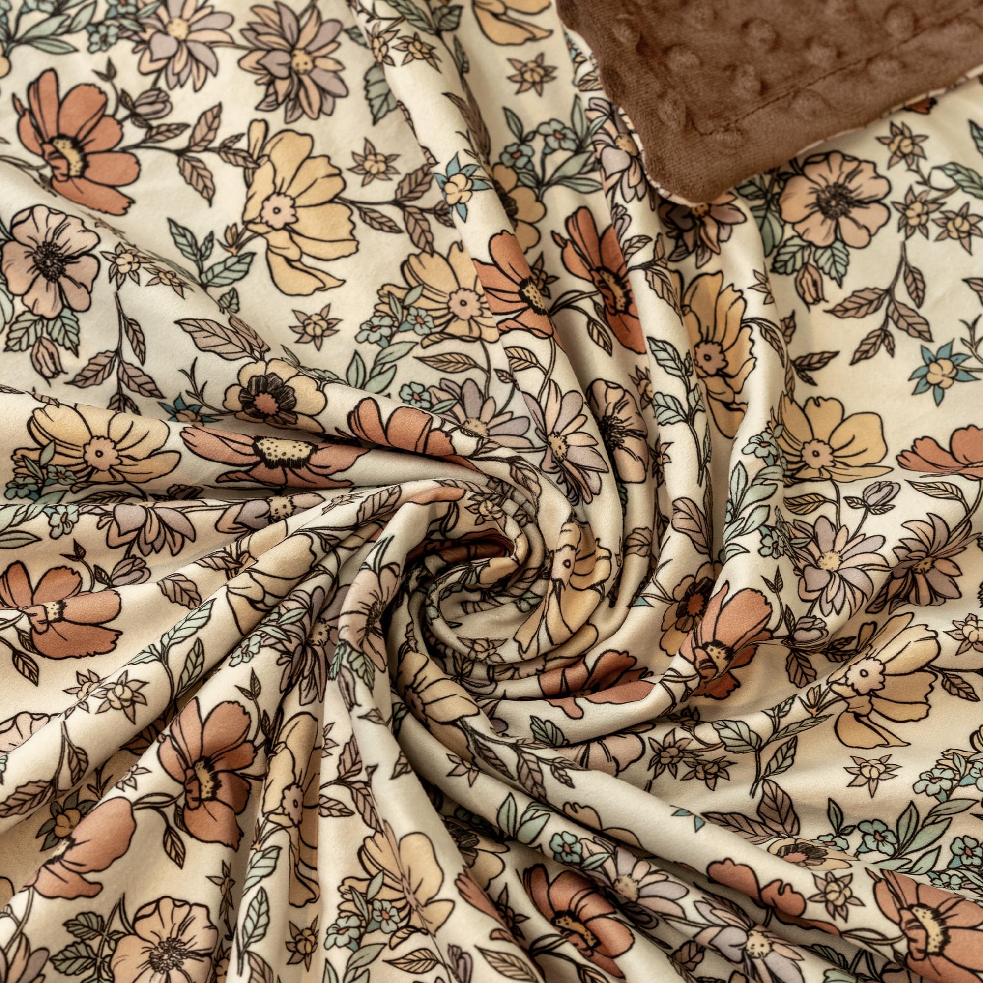 Vintage Floral Design:The fleece baby blanket features multi-colored retro flowers and delicate leaves in soft tones, plus a warm brown backing, bringing an elegant and cozy look to your baby's room.Its vintage visuals make both baby and parents feel more delighted during play or rest time.
