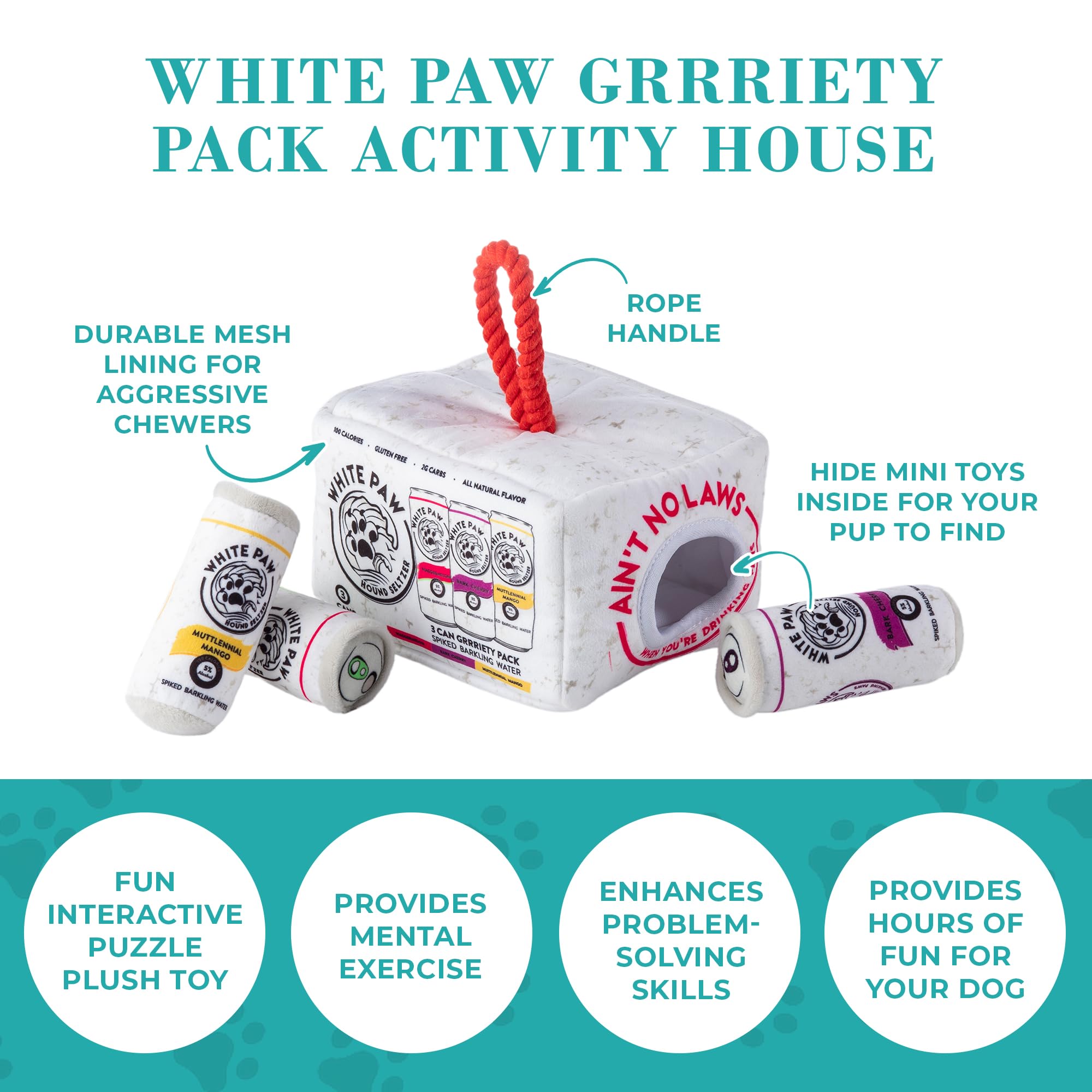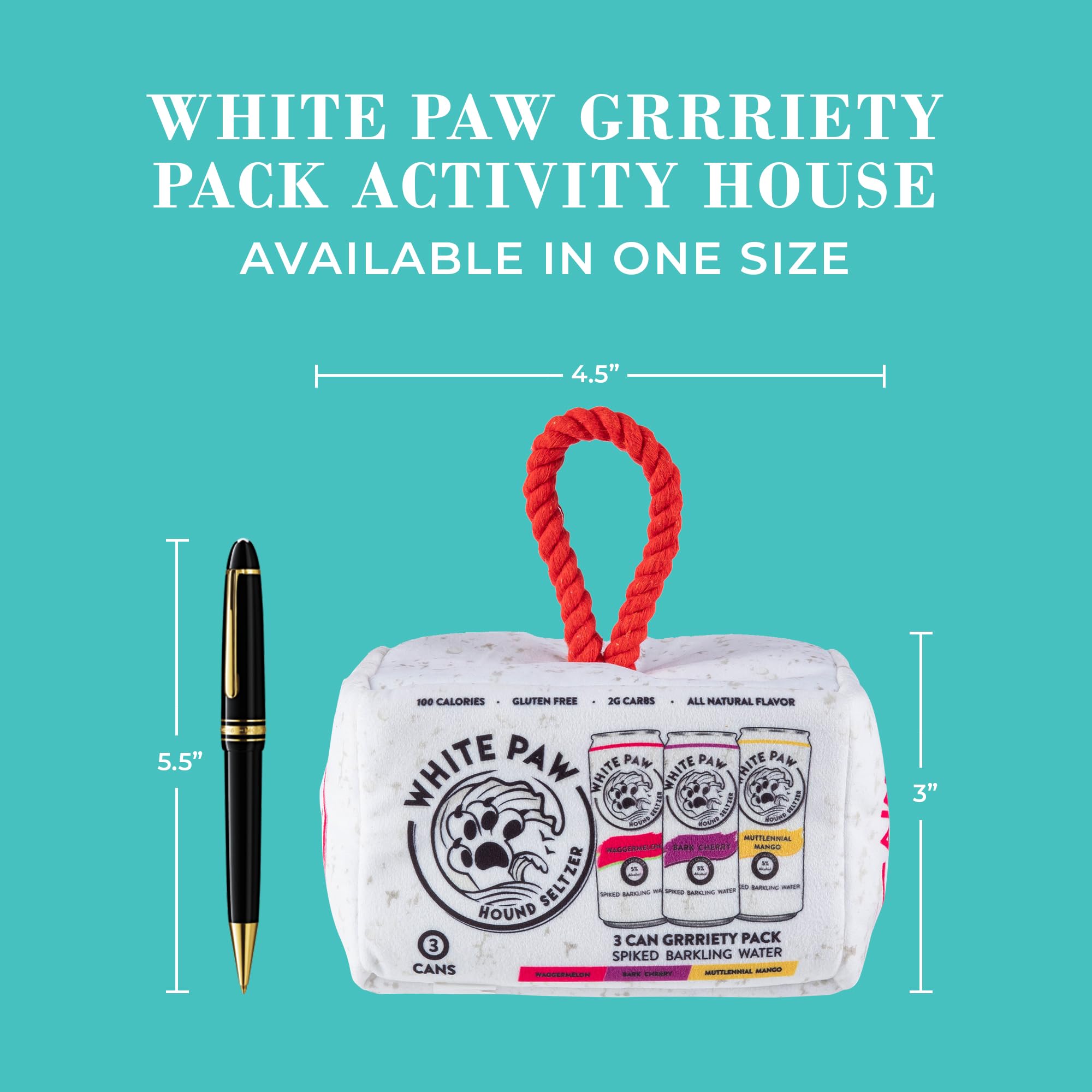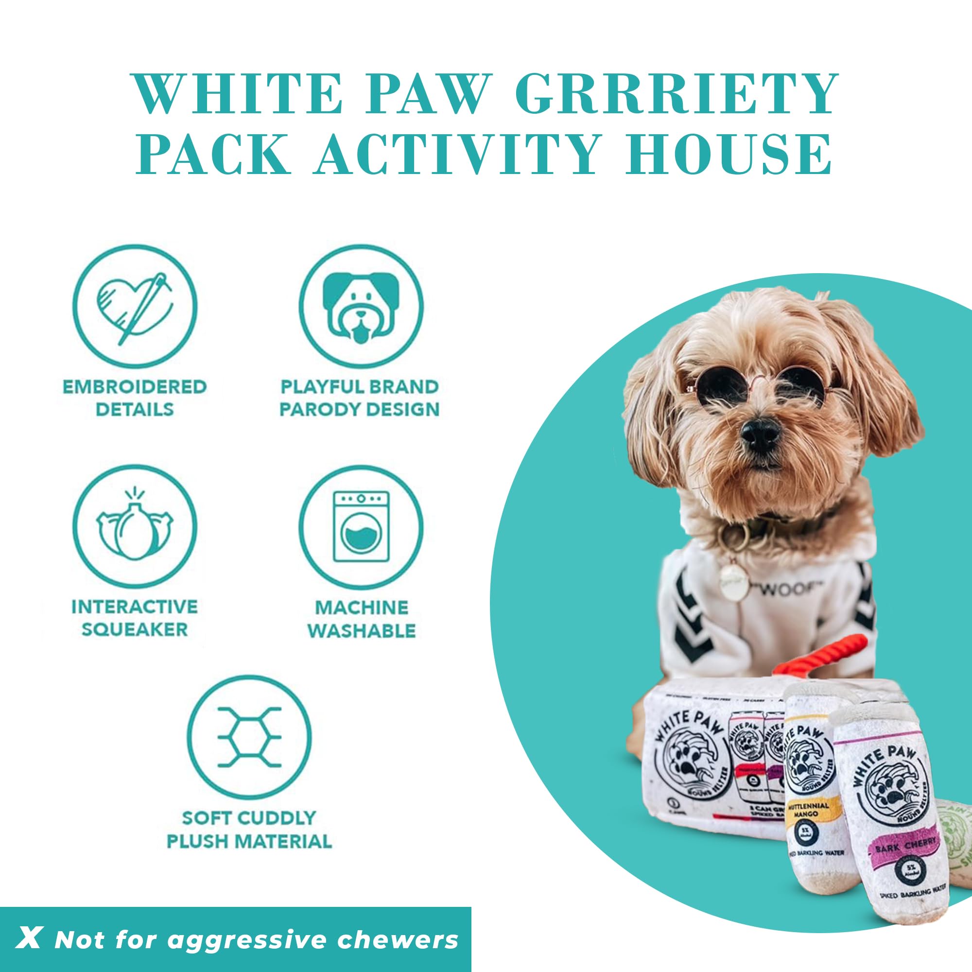 Funny Parody Plush Dog Toy: Your furry friend will want to crack open a cold one playing with our White Paw Grrriety Pack Activity House that features three mini White Paw cans as interactive elements for your pup. It’s a playful, cute dog puzzle toy that combines style & fun. One Size, Trunk 4.5"x3”x1.5”