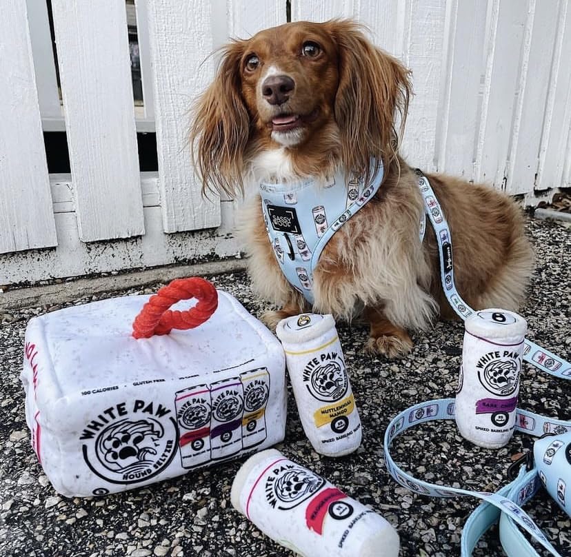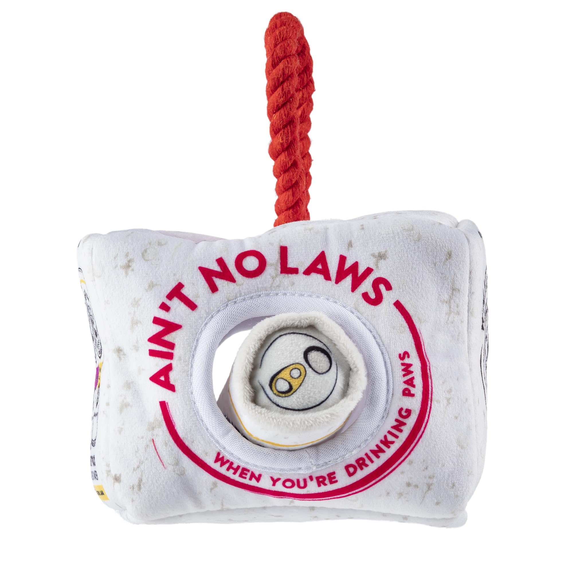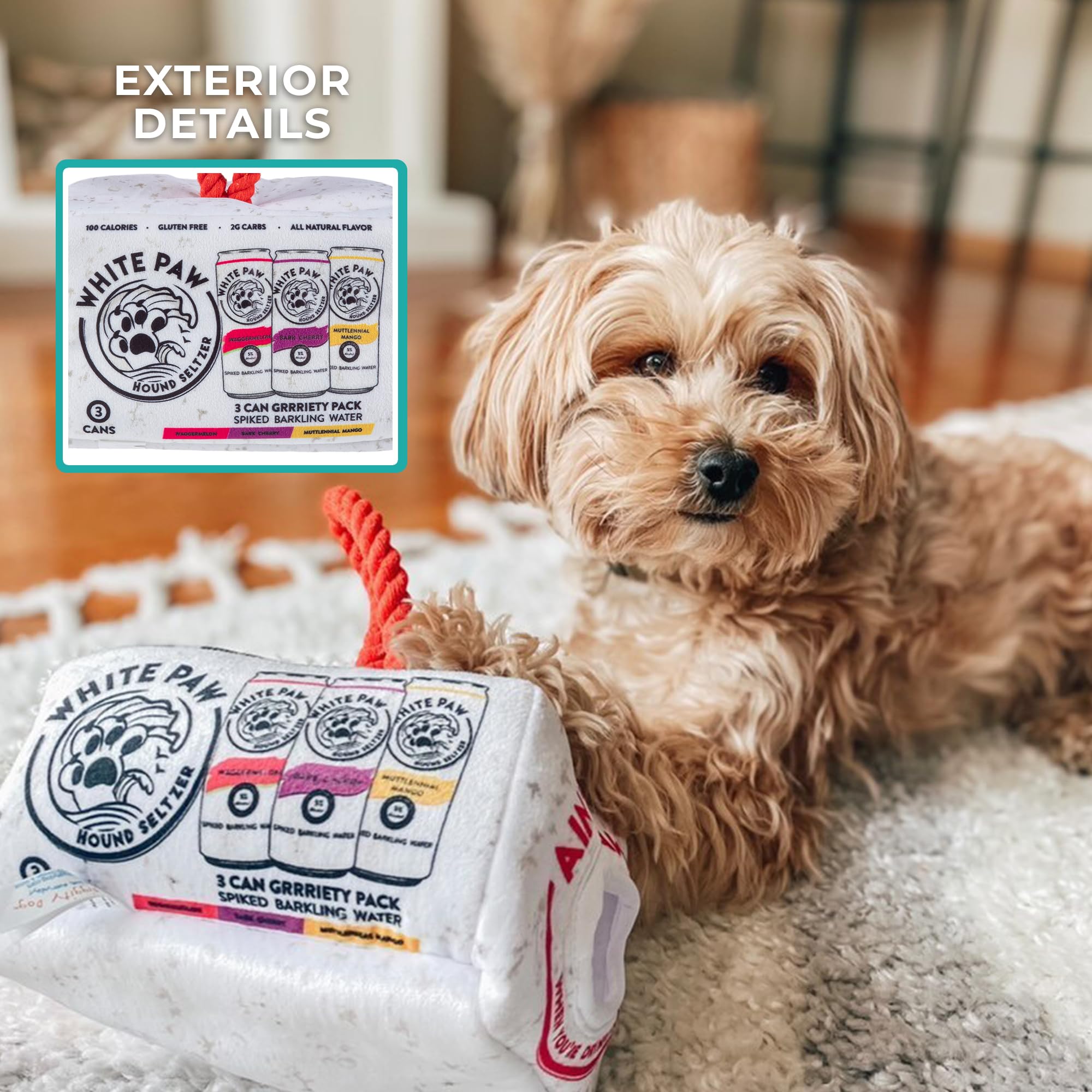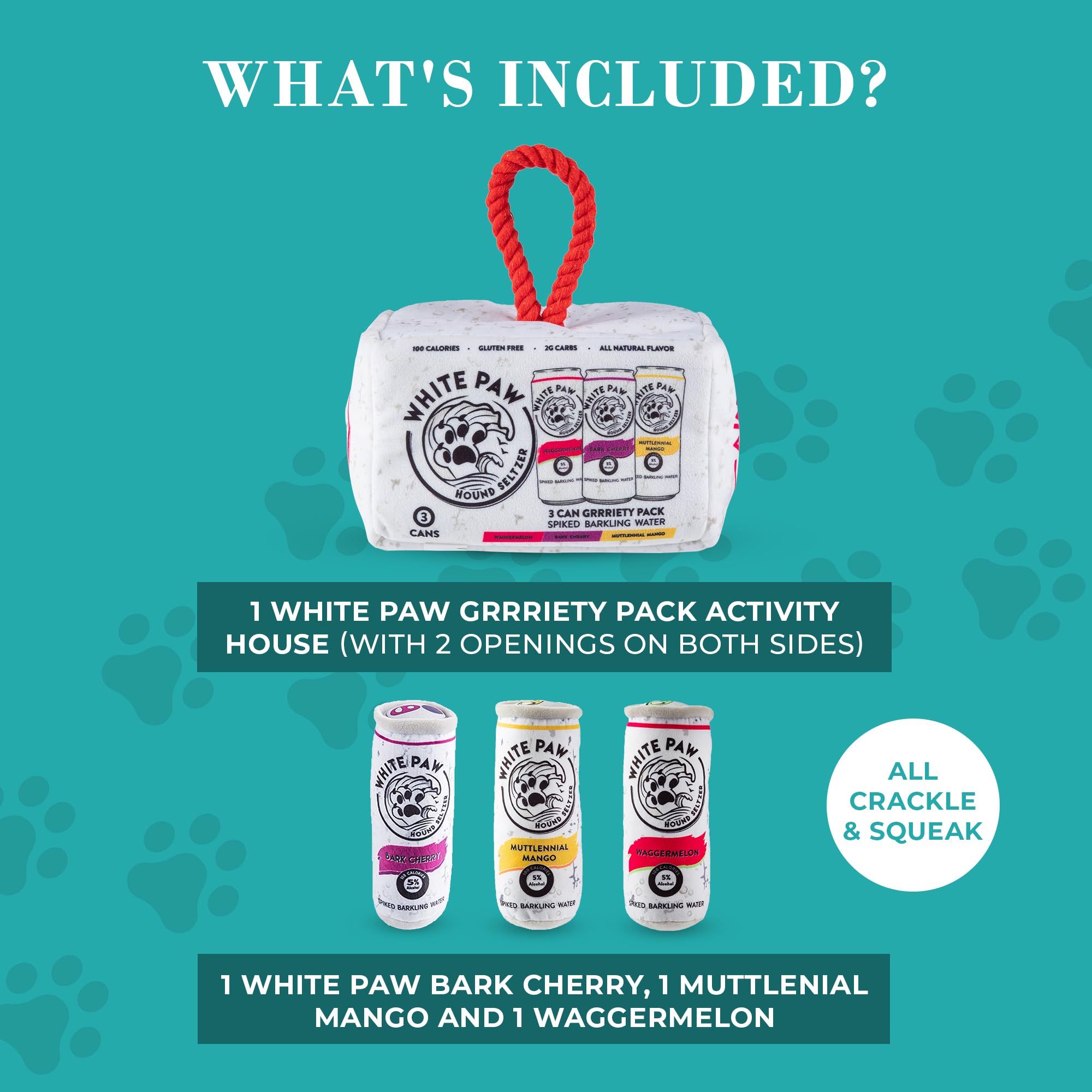 Funny Parody Plush Dog Toy: Your furry friend will want to crack open a cold one playing with our White Paw Grrriety Pack Activity House that features three mini White Paw cans as interactive elements for your pup. It’s a playful, cute dog puzzle toy that combines style & fun. One Size, Trunk 4.5"x3”x1.5”