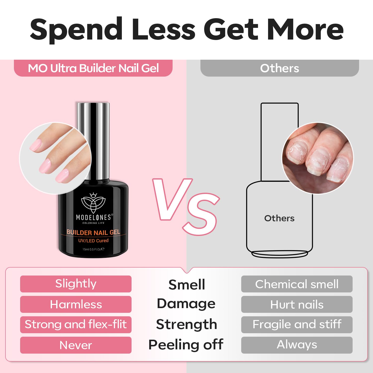 30 Days No Peel-Off & No Bubbles: Modelones nail thickening builder nail gel is made of professional formula, which is adjusted after 72 tests. Say goodbye to air-bubble and peel-off problems. High durability clear gel builder can stay last longer and brings you natural, strong, flexible, and feather-light nails. Long-lasting for 30+ days with with proper application