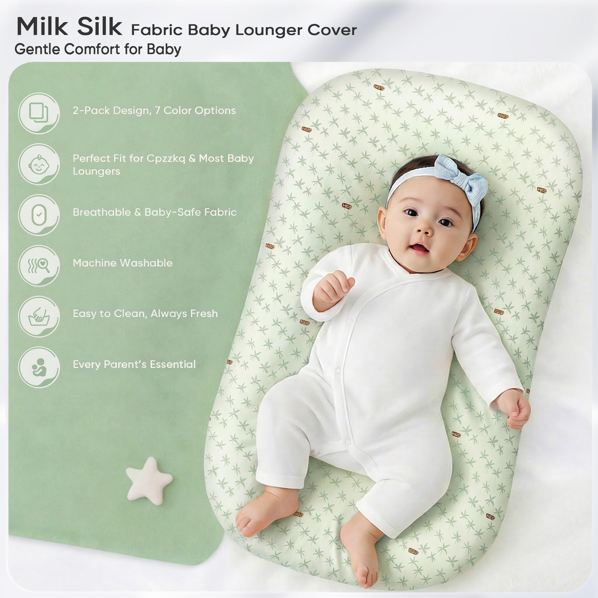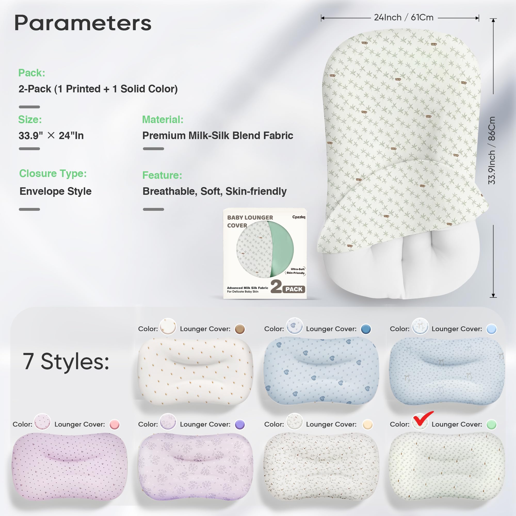 Give your little one the comfort they deserve with our 2-Pack Baby Lounger Covers, perfectly sized for the Cpzzkq baby lounger and most standard loungers (33.9" x 24"). Each set includes one printed and one solid-color cover — an easy way to refresh your nursery and switch styles in seconds. Crafted from silky milk-silk blended fabric, these infant lounger covers feel soft and smooth against delicate skin. The breathable, quick-dry material helps keep your baby fresh and comfy during tummy time, play, or cuddle sessions in the nursery. Designed with gentle, hypoallergenic materials and an envelope-style closure for a snug fit, each lounger cover is machine washable, shrink-resistant, and odor-free — making cleanup effortless for busy parents while keeping your baby’s space fresh. A perfect balance of beauty and function, our baby lounger covers bring comfort, safety, and style into your nursery — because your baby deserves the softest touch every single day.