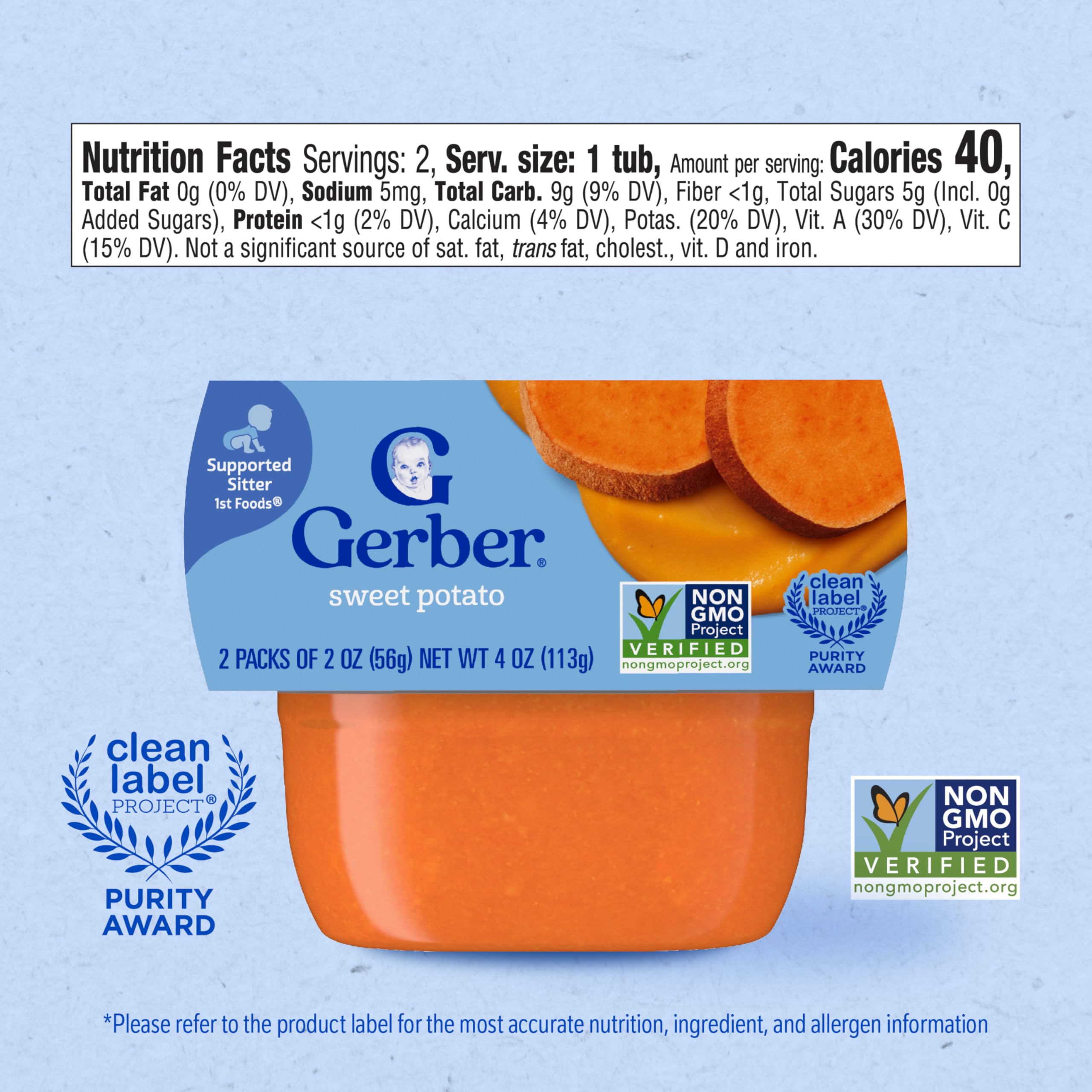 Gerber Stage 1 Baby Food, Sweet Potato Puree Tubs are a premium choice for your child’s early stages. Crafted to help support their nutritional needs, along with meeting the busy lifestyle needs of caretakers and parents. Each baby puree tub comes in a portable, easy-to-store format – making it perfect for life’s busy moments. This stage 1 baby food puree is designed for babies who are able to sit with help or support and who are ready to start introducing solids into their diet. Gerber understands the importance of providing wholesome ingredients during the crucial developmental stages of your child's life -- that’s why our baby puree is Non-GMO Project Verified. Gerber baby puree is ideal for parents who seek a convenient and high-quality option in their baby's diet. These tubs need to be refrigerated after opening and must be used after 1 day.