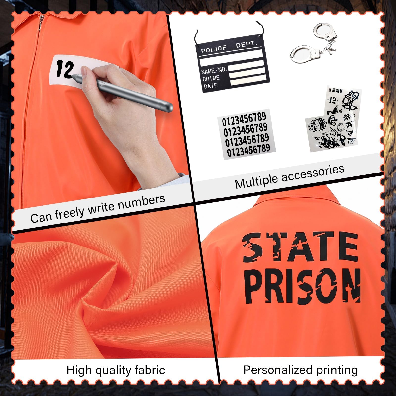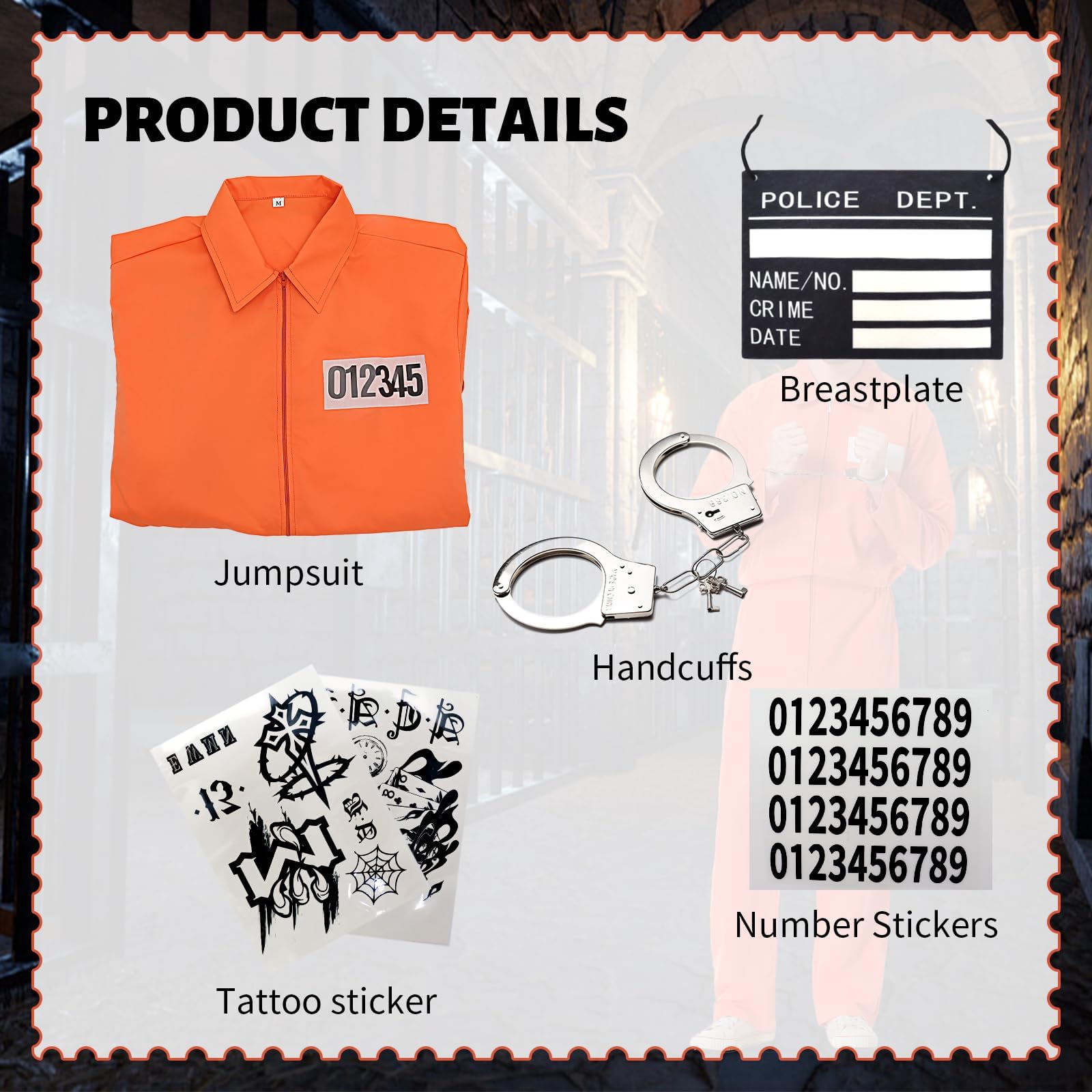 Prisoner Jumpsuit Accessories Include: 1 * Prisoner Jumpsuit Unisex Adult+1 * Novelty Prop+2 * Tattoo stickers+1 * Number Stickers+1 * Nameplates. Halloween prisoner costumes adult, Perfectly recreate the prison style of prisoners