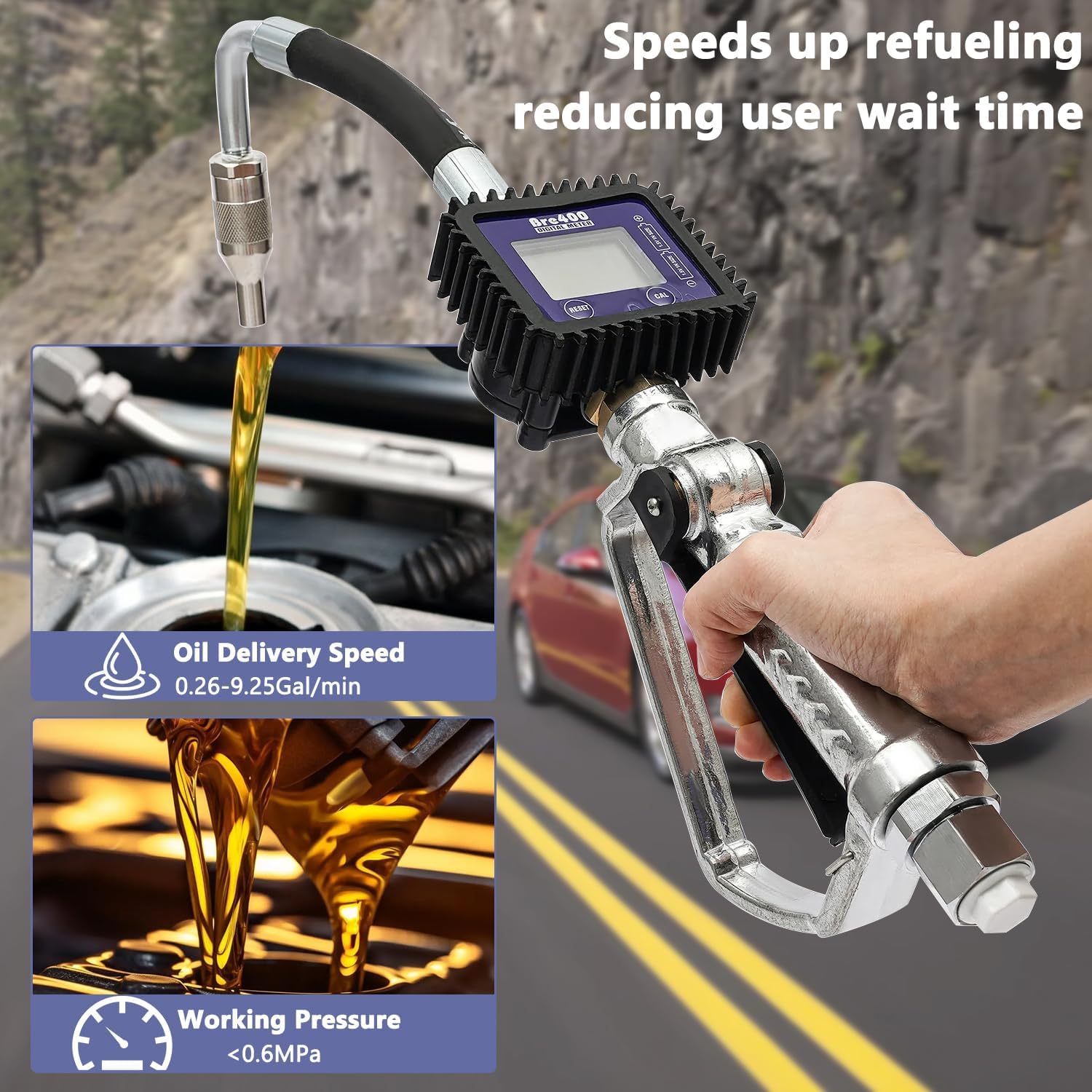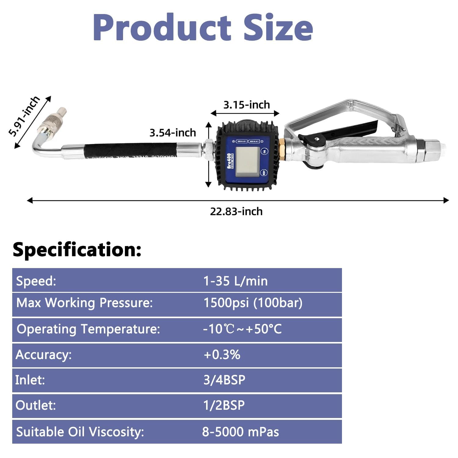 SPECIFICATIONS: The oil dispenser automotive supports a max flow rate of 190 (LPM 50 GPM), Speed: 1-35 L/min, the max pressure of 160 BAR, inlet connection of 1/2" inch NPT Female, powered by a 2 x 1.5v LR1-N battery