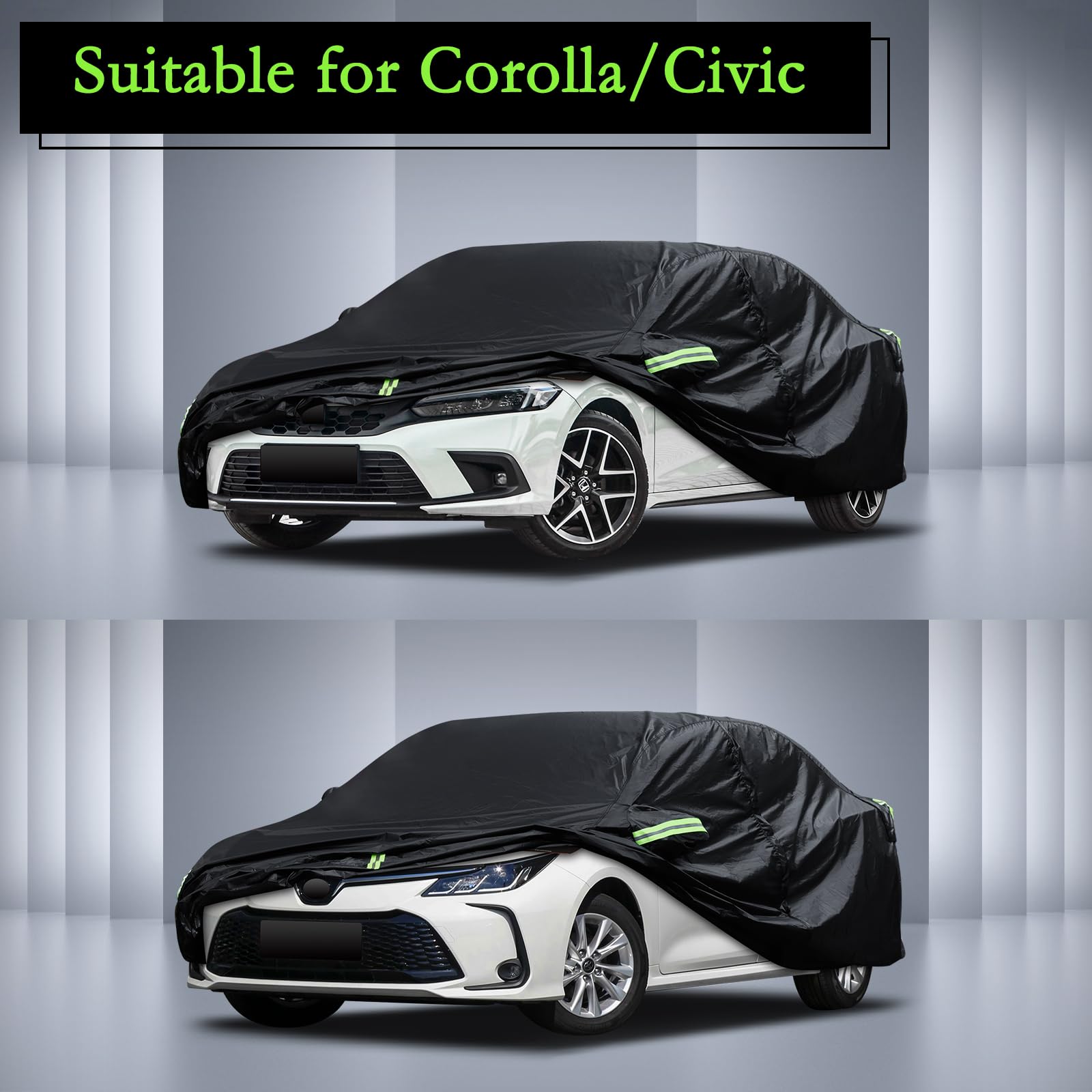 All-Weather Protection - This car cover is custom design for Toyota Corolla (2000-2025), Honda Civic sedan/coupe (1991-2025) ,not fit for hatchback. It provides comprehensive protection for the car from all-weather factors in the four seasons of spring, summer, autumn, and winter, such as dust, snow, industrial pollution, bird droppings, leaves, pollen, acid rain, ultraviolet light, intense sunlight, heavy rain, etc.