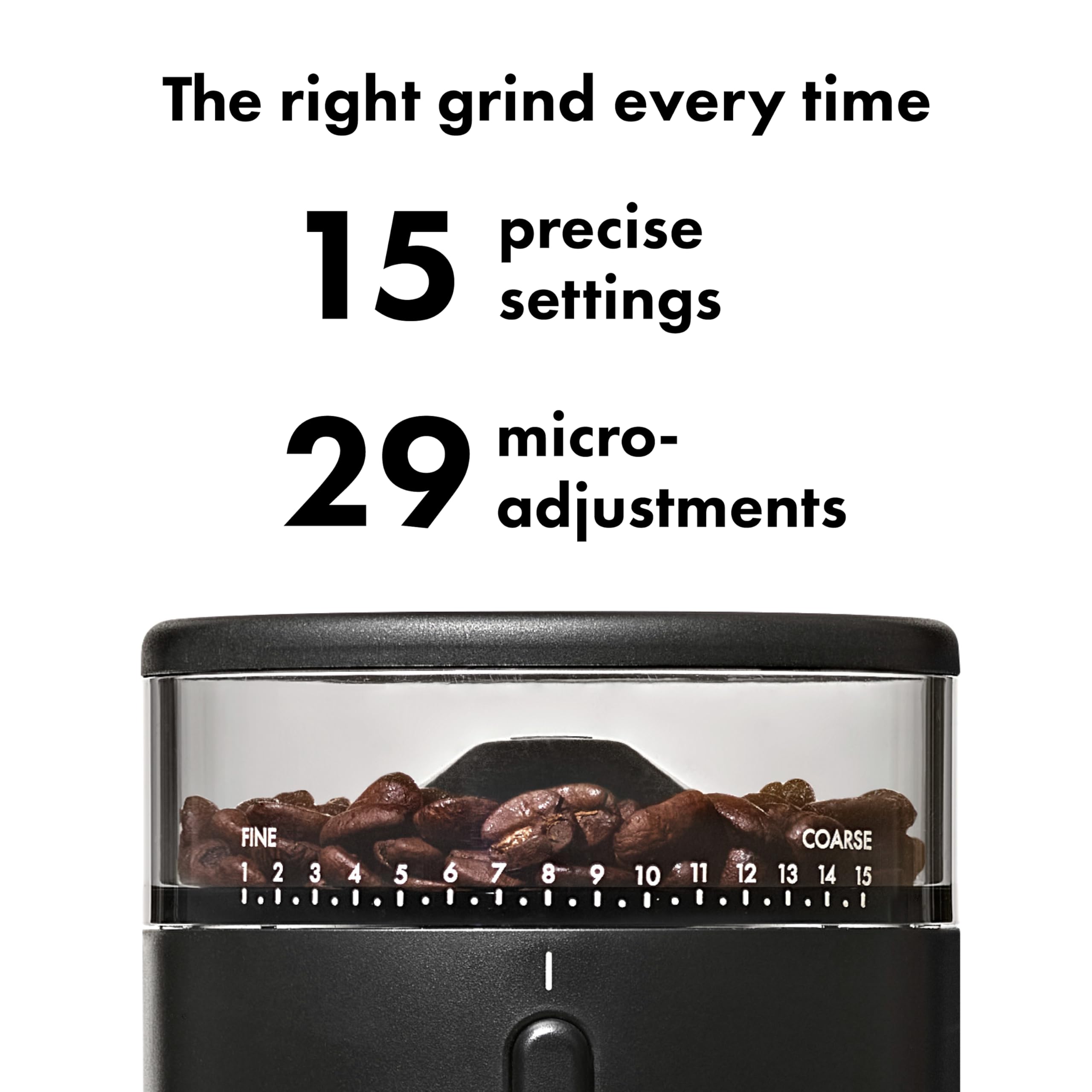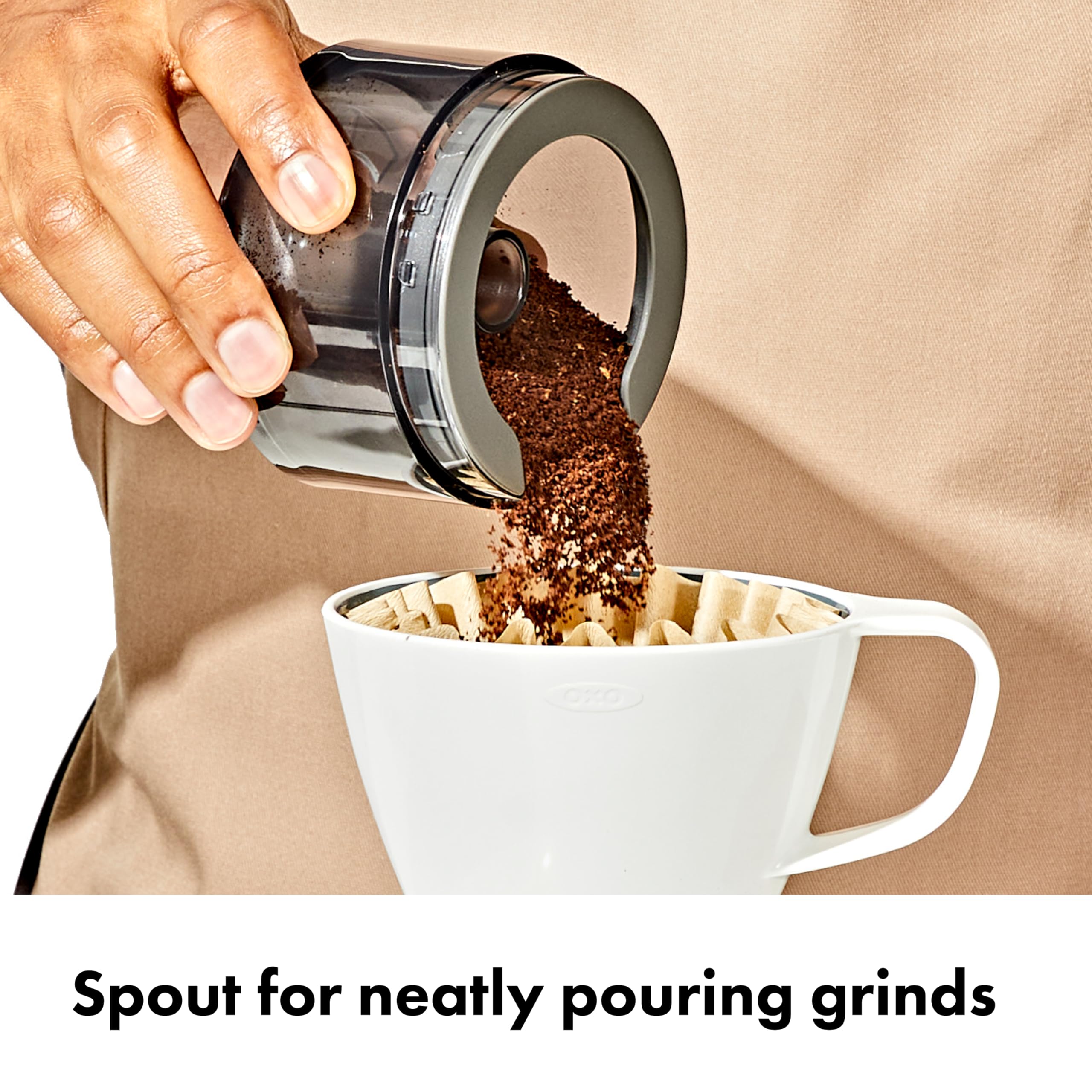 The OXO Brew Compact Conical Burr Coffee Grinder delivers the power of a full-size electric grinder without the bulk. Choose from 15 settings and 29 micro-adjustments to get your perfect grind time after time. The stainless steel conical burrs ensure a consistent, high-quality grind, critical to maximizing flavor. The hopper holds up to 50 grams of coffee beans, perfect for making up to 6 cups or 30 ounces of brewed coffee. The grinds container features an integrated spout for neatly pouring grounds. The grinder’s upper and lower burrs come apart for easy cleaning, and the chuteless design makes the grinder itself easy to reach and clean. The cord wraps neatly for storage, and the compact size is perfect for countertop display. The hopper and grounds container are also made from Tritan™ Renew, composed of certified recycled content through a mass balance allocation process that transforms plastics destined for landfills into high-performance, food-safe materials. To clean, wipe the grinder body and hopper with a soft, damp cloth. Wash the grounds container with soap and water, then dry it thoroughly.