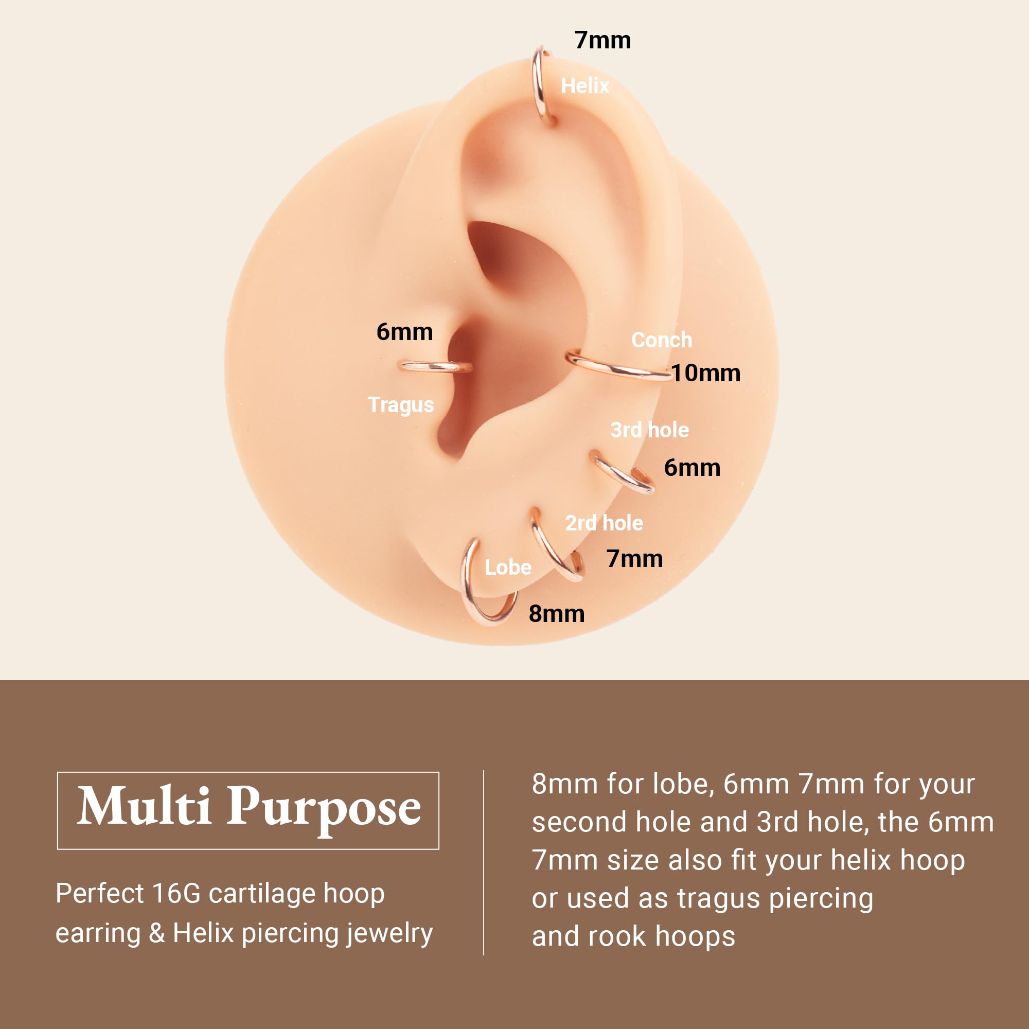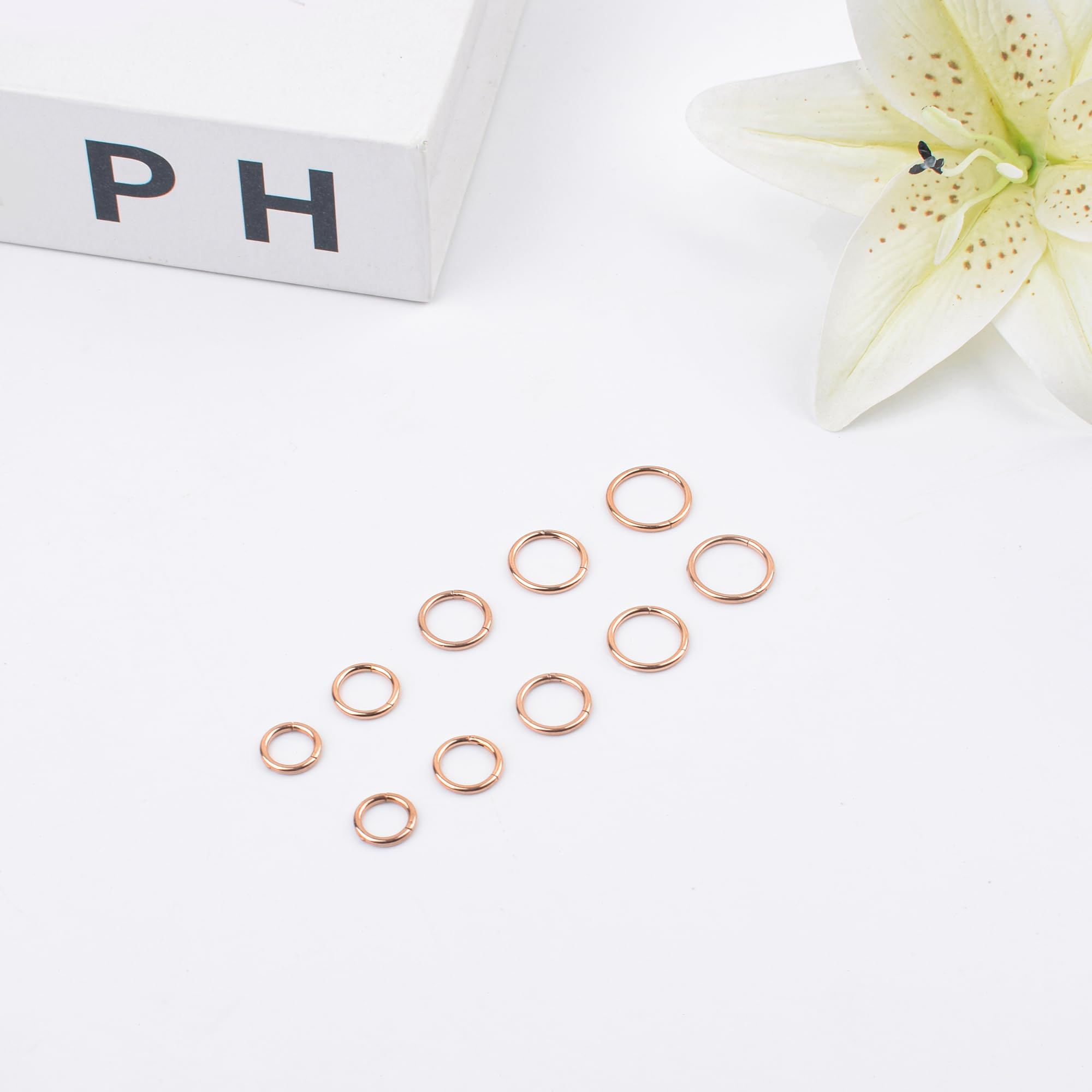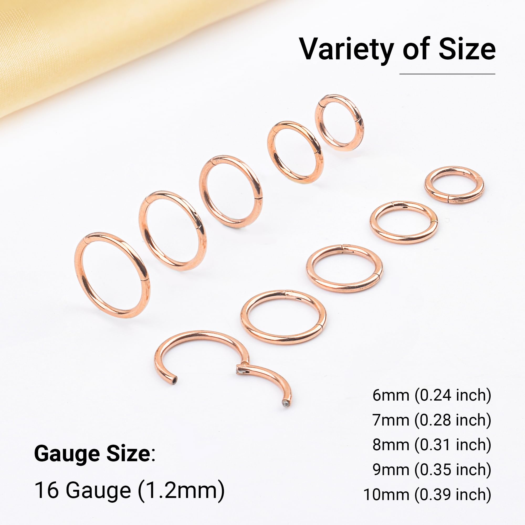 【GAUGE & SIZE】: The gauge size 16G(1.2mm), the inner diameter: 6mm hoops, 7mm hoops, 8mm hoops, 9mm hoops, 10mm hoops, suitable 16g small hoop earrings or 16 gauge nose rings.