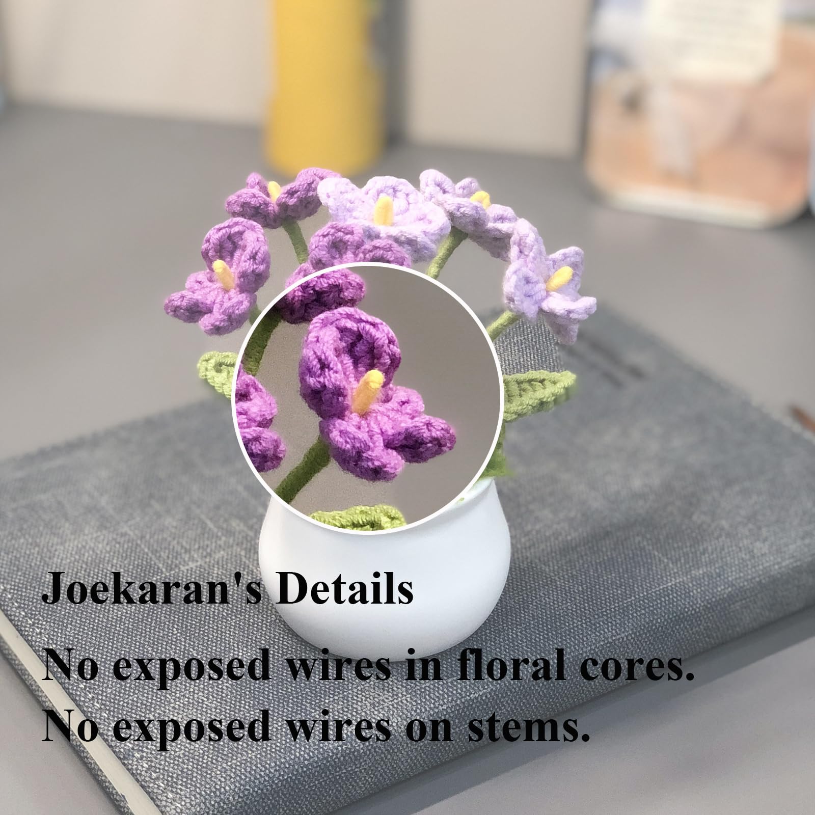 1.【Joekaran's Details】 No exposed wires in flower cores & stems; Realistic crochet grass in pots; Request returns if not as described.
