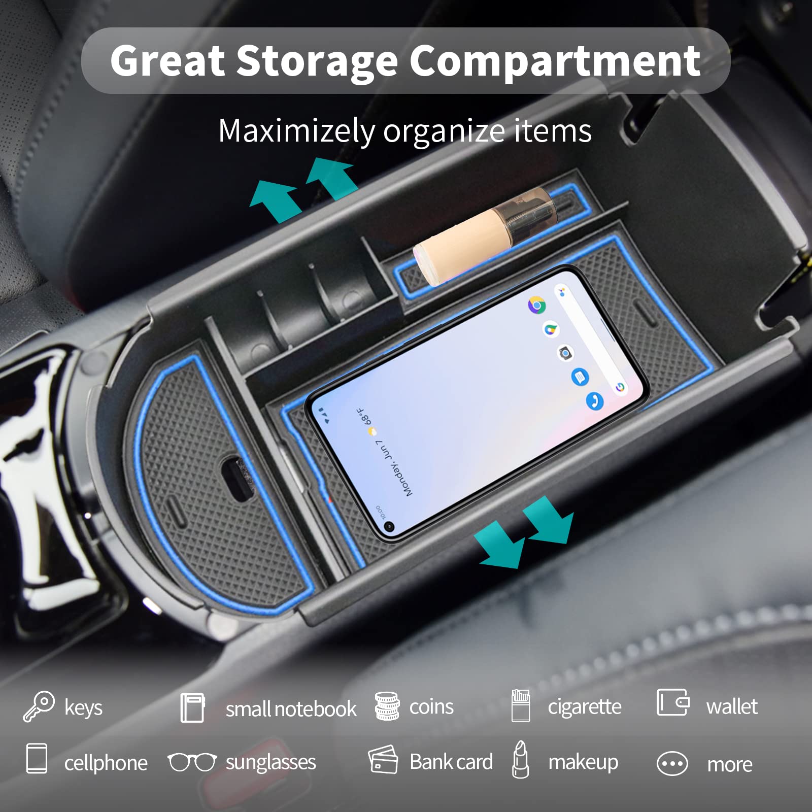 【Keep Things Organized】 You can put some items below the 2022 C-HR organizer, like cellphone, sunglasses, pens, credit cards. Help C-HR owners easier to get to things they don’t want to dig around the center console for. Add extra storage space for coins, easy to take in and out
