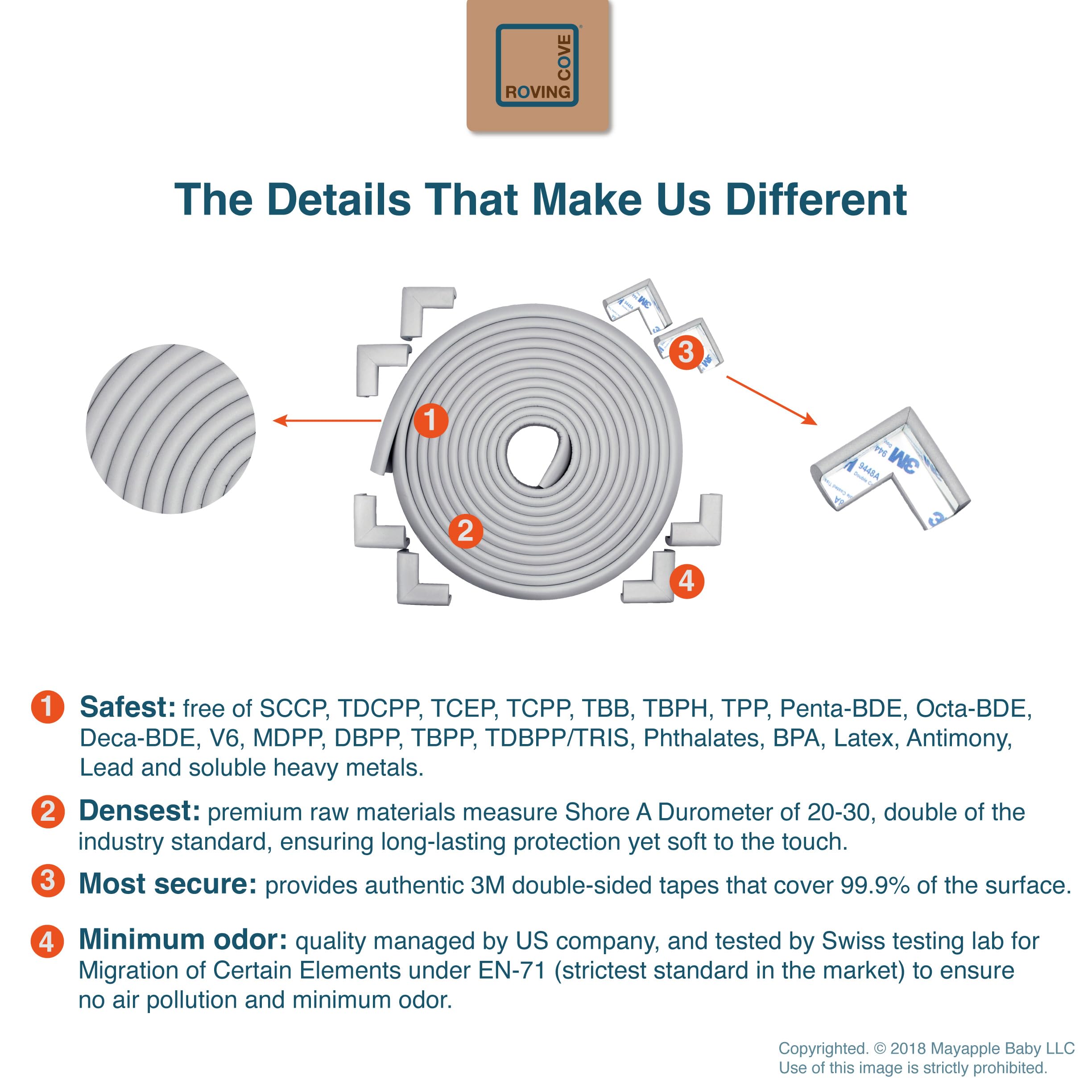 CLEAN SAFETY: Roving Cove uses safe and pure raw material and was the first brand to make foam safety bumpers without the use of toxic flame-retardant chemicals (SCCPs). Our edge corner guards contain no BPA, no phthalates, no heavy metals, no latex, no SCCPs. Inherently flame-resistant; passed flammability tests under US regulations.