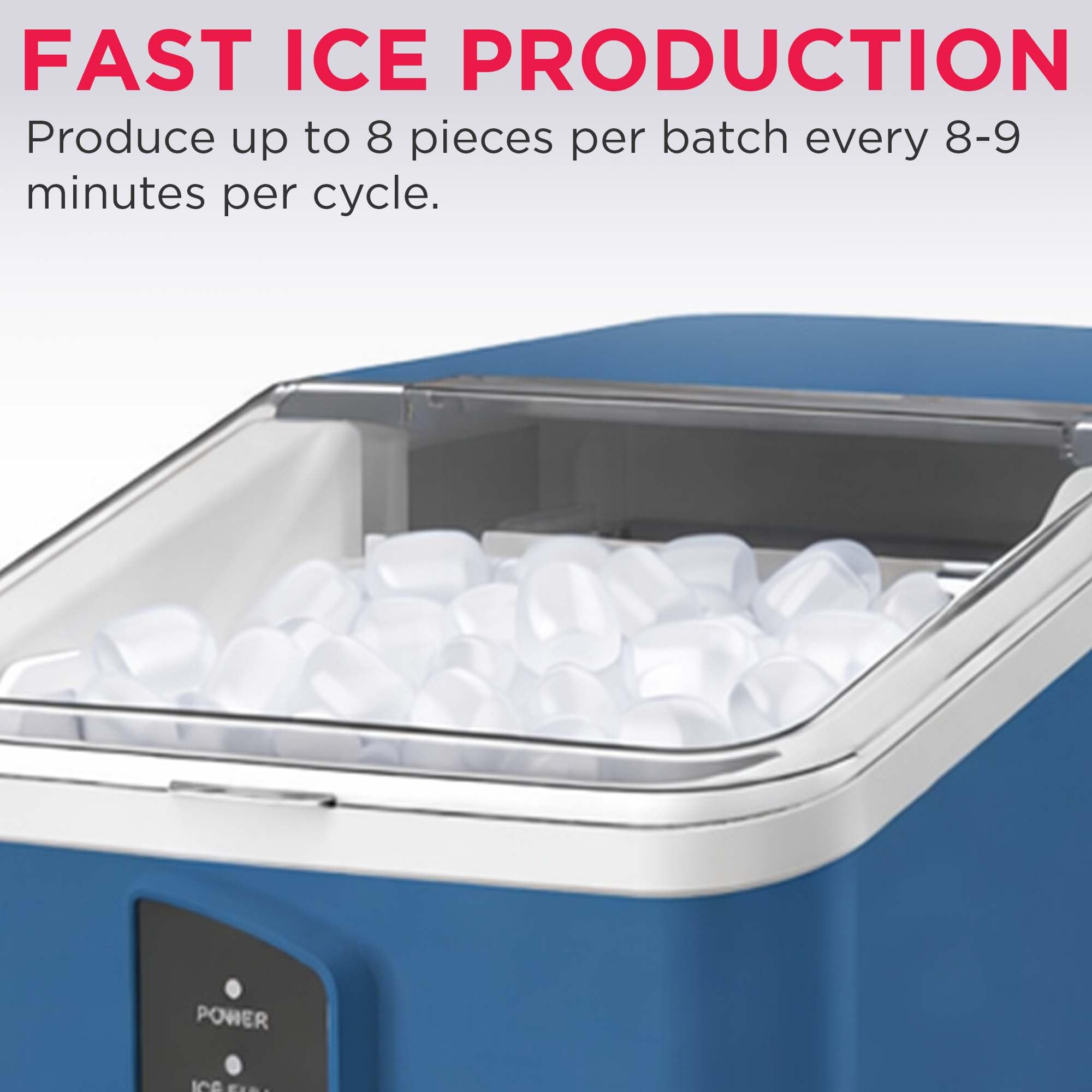 EFFICIENCY: Each 5-6 minute cycle produces 9 ice cubes, with a total capacity of 26lbs in 24 hours. When unused ice melts, the machines recycle the water to produce a fresh batch of ice. At any time, you may enjoy fresh ice