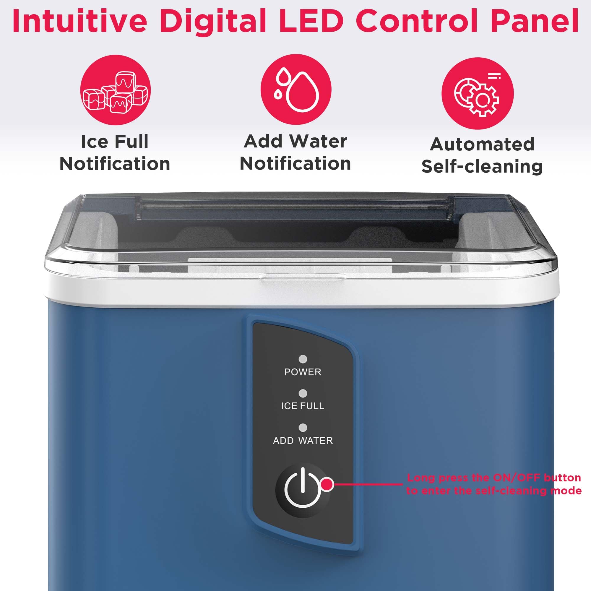 FUNCTIONALITY: When the basket is full, our ice maker indicators will remind you to take out the ice cubes, and when the ice maker is low on water, it will alert you to add more
