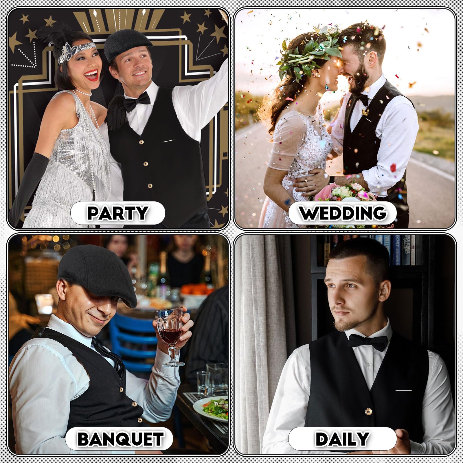 【Carefully Selected Materials】: The Roaring 20s costume accessories set is made of high-quality materials. The classic black vest is made of high-quality polyester fiber, which is soft, comfortable, lightweight and breathable, making it perfect for daily wear and important occasions. This 1920 men's suit combines comfort and fashion, making it a perfect choice for attending parties.