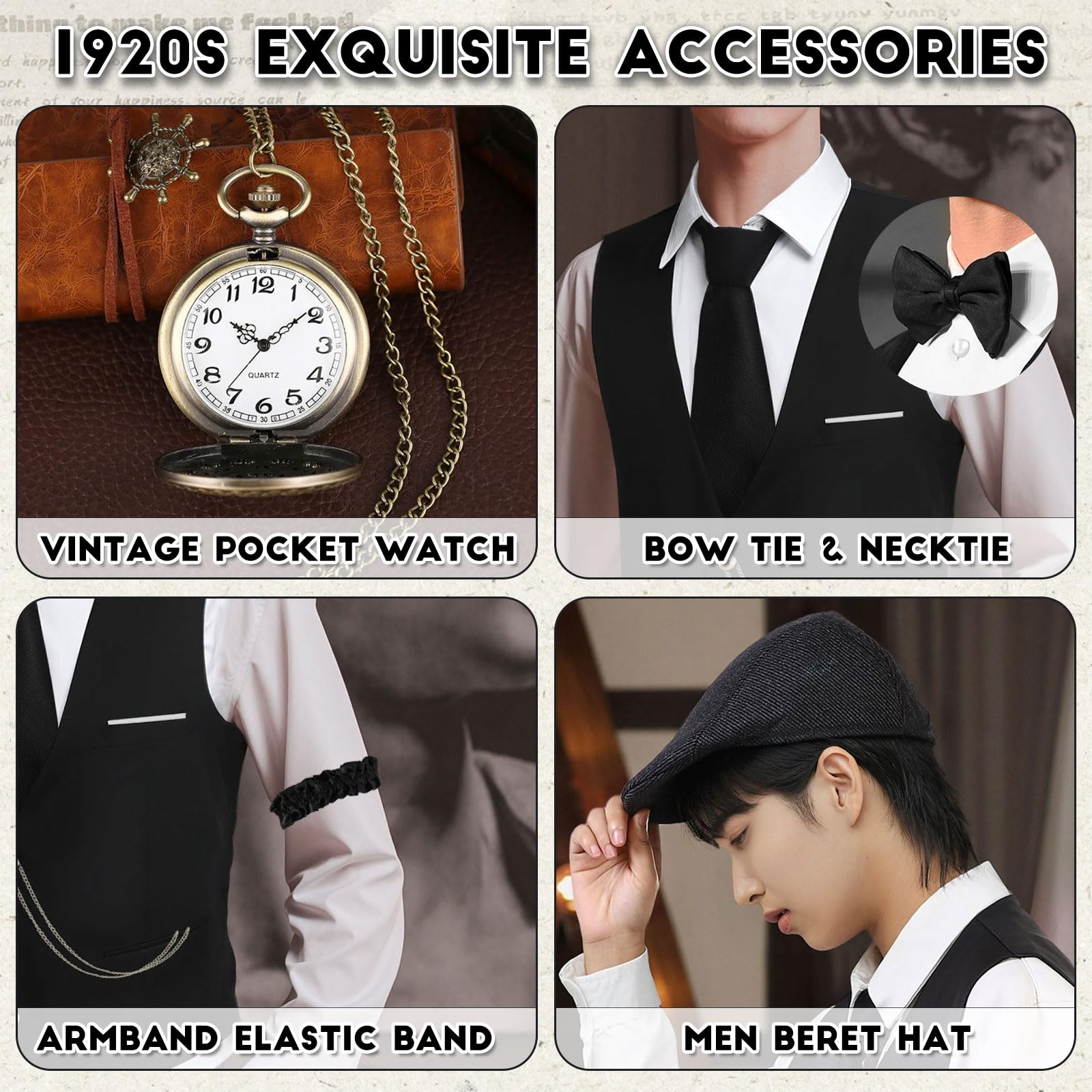 【20s Outfit Accessories】Vests, hats, vintage pocket watches, bow ties, neckties, and armbands are essential accessories for playing a 1920s man. Vintage pocket watches with chains are great accessories, while bow ties, neckties, and armbands are beautiful additions to your outfits for theme parties, adding the finishing touch to your 1920s look and taking you back to that wonderful, frivolous era.