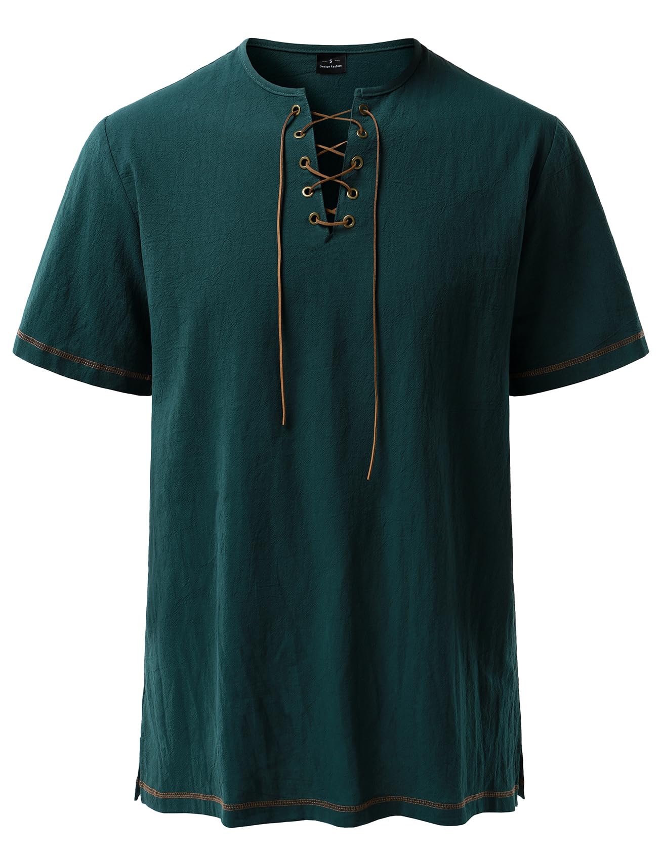 Design Concept: Mid-long tunic top / Contrast color drawstring design / Bronze buttonholes with retro buttons / Regular fit / V neck / Side slit / Short Sleeves