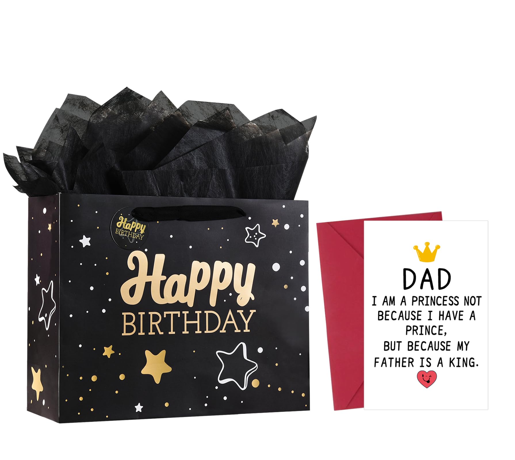 【Happy Birthday Gift Bag】Gift bag set includes a gift bag, a greeting card for dad, and 2 sheets of tissue paper; the gift bag is 13 inches wide x 10.2 inches high x 4.7 inches long, and the greeting card is 7.9 inches wide x 5.9 inches high.