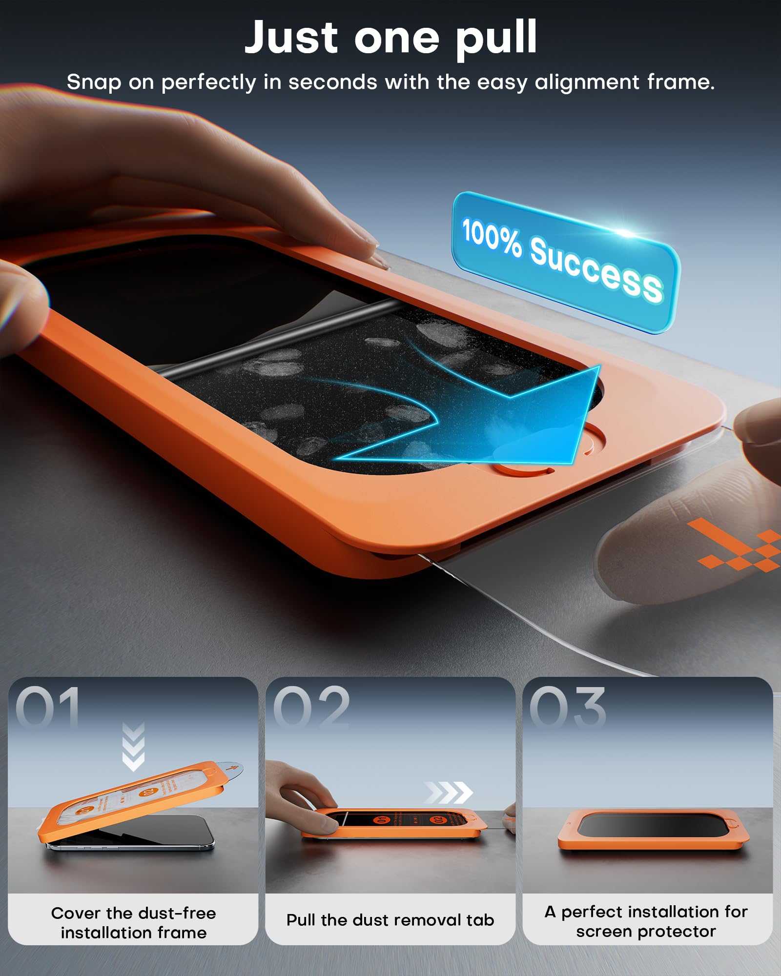 Effortlessly Simple Application: Experience the easiest installation process ever designed for a screen protector. Simply position the alignment frame on your iPhone Air, gently pull the plastic tab, and watch as the high-quality glass seamlessly settles onto your display. No complicated steps, no messy adhesives, and no frustration. It’s installation made foolproof—so simple you’ll hardly believe it’s done