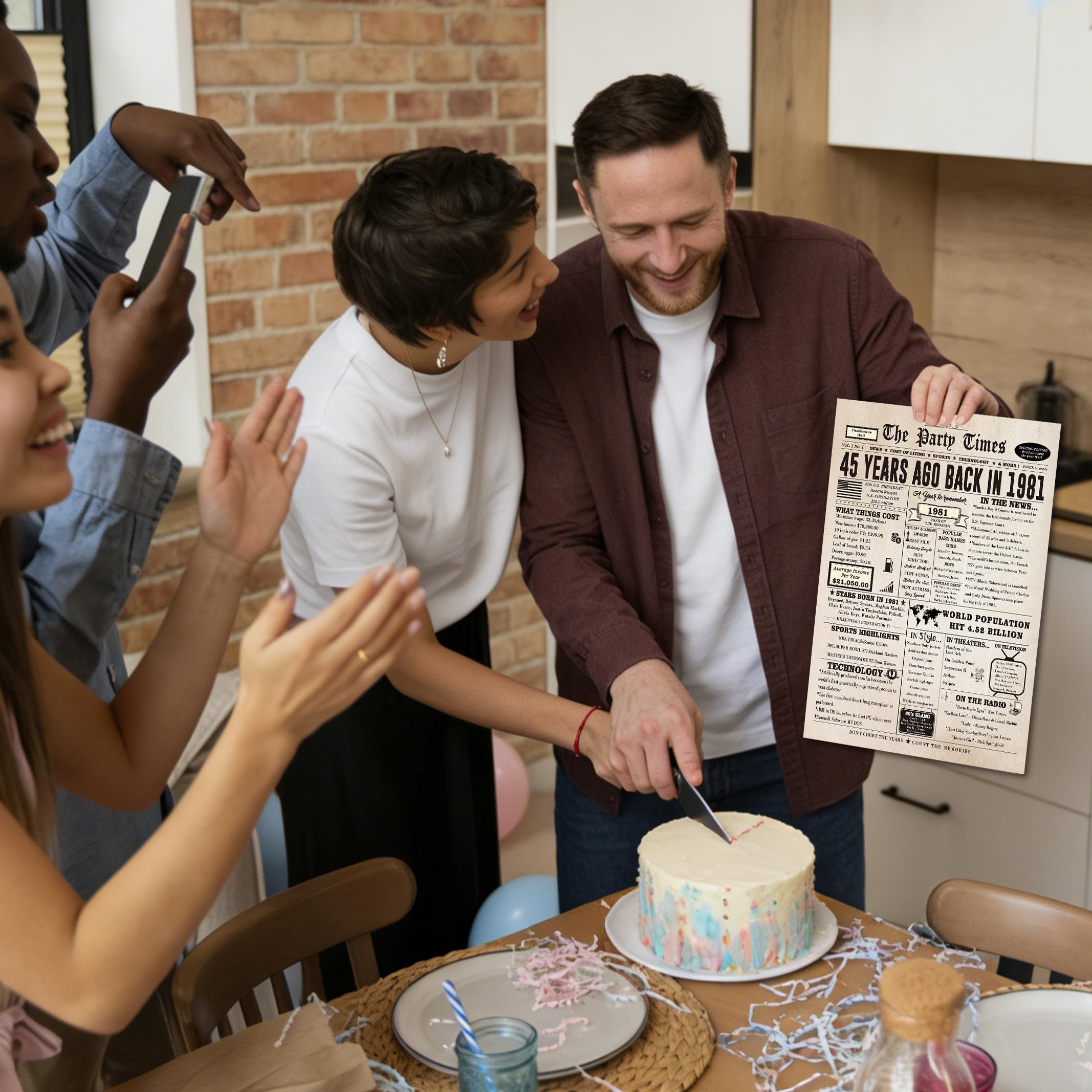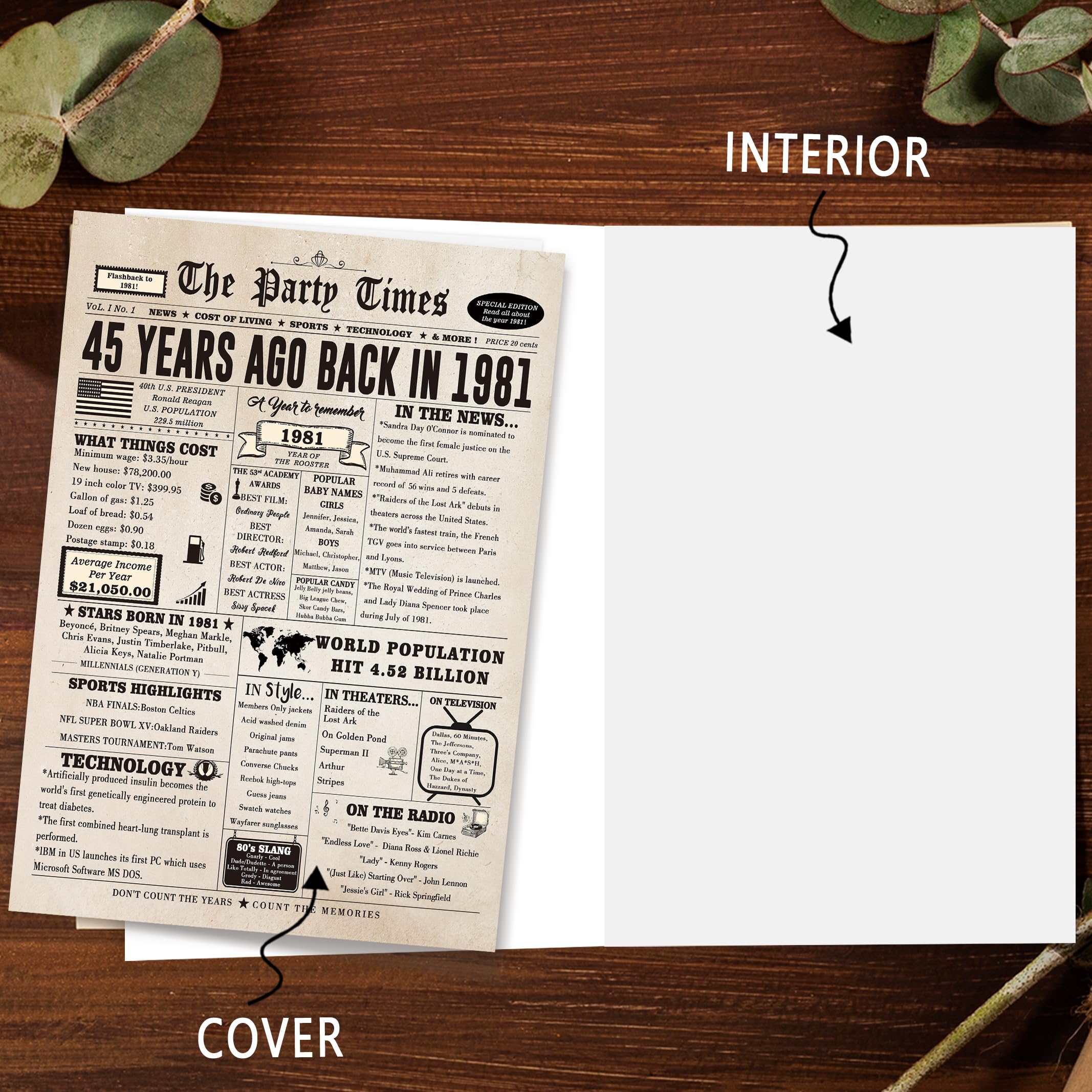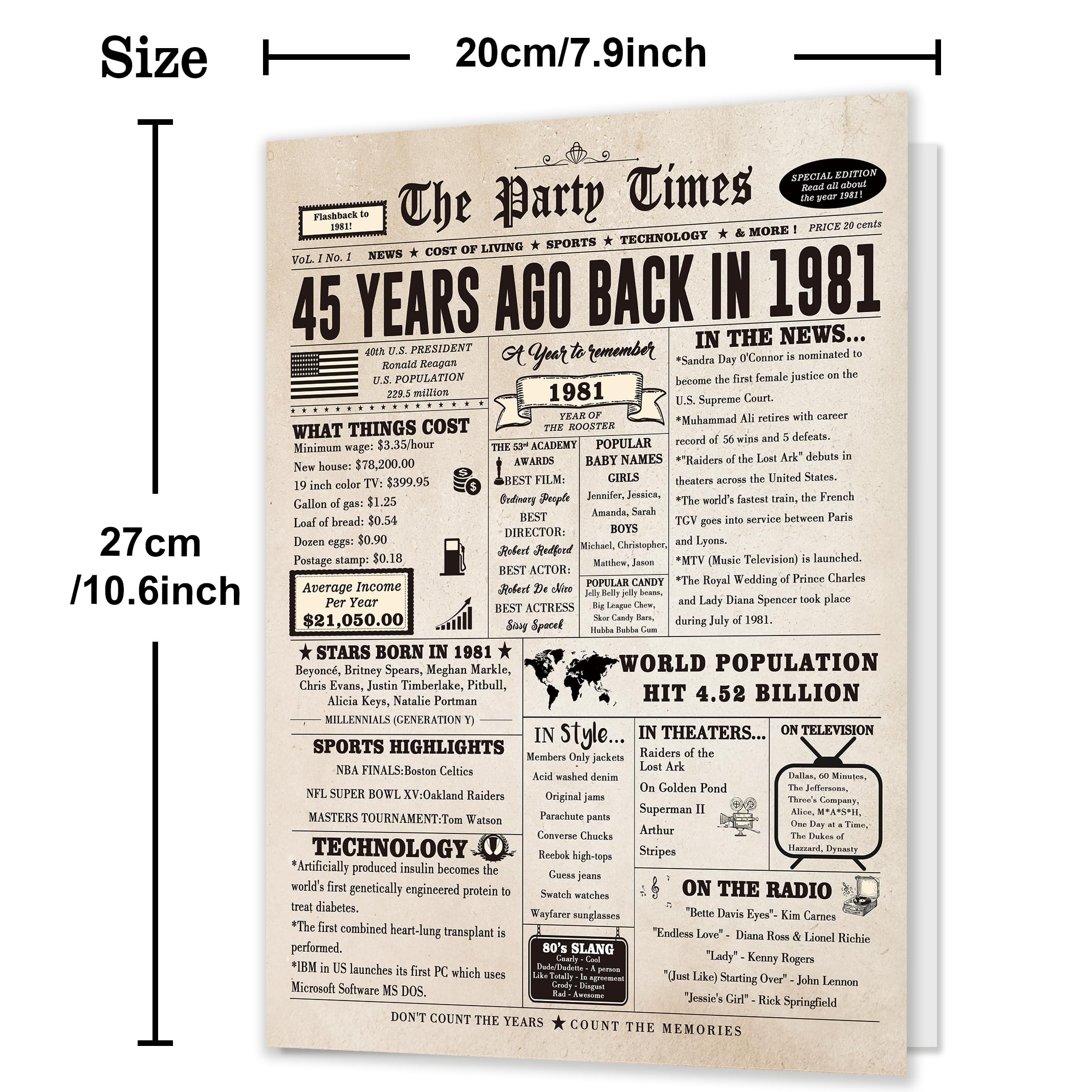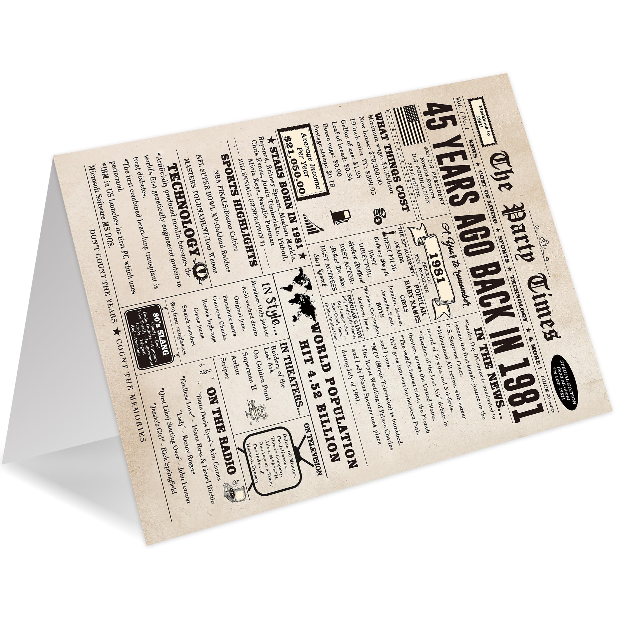 This large 45th birthday card features a vintage newspaper design, showcasing important events, movies and sports events from 45 years ago